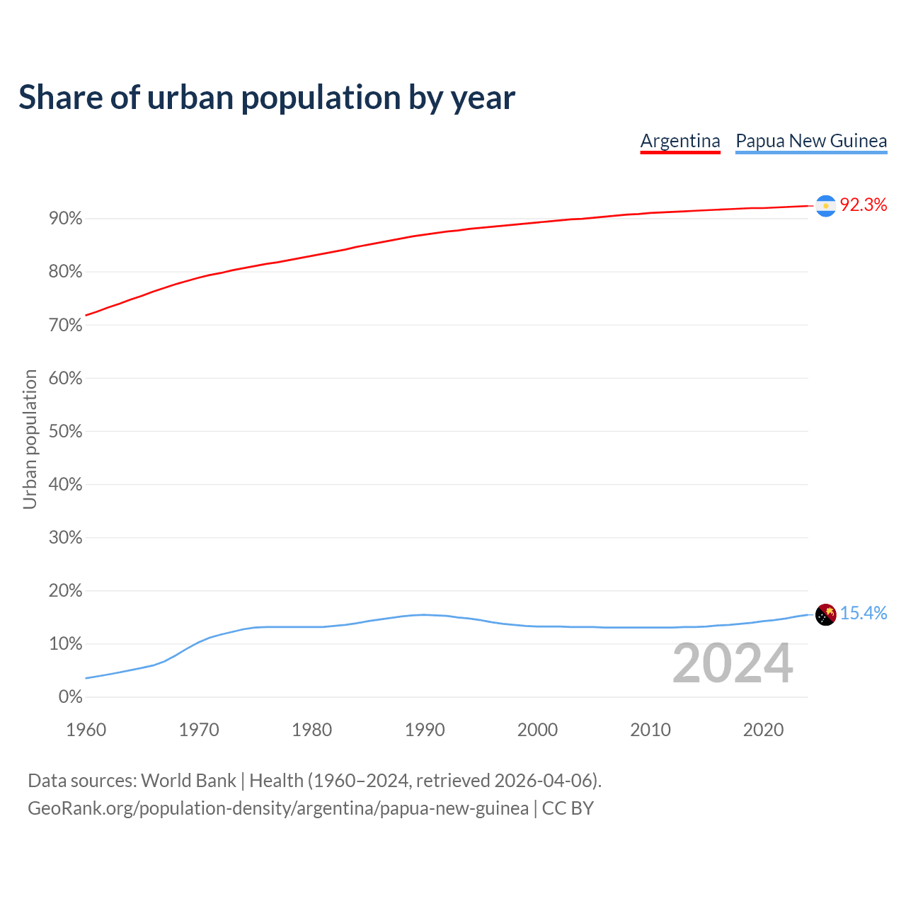 From 2004 to 2024, the share of urban population changed from 89.9% to 92.3% in Argentina and from 13.1% to 15.4% in Papua New Guinea.