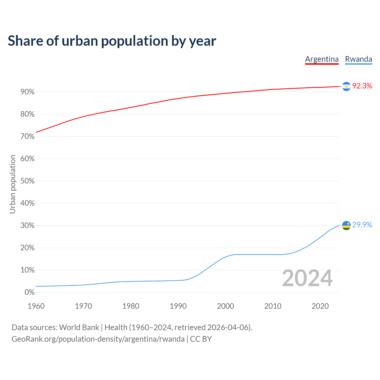 From 2004 to 2024, the share of urban population changed from 89.9% to 92.3% in Argentina and from 16.9% to 29.9% in Rwanda.