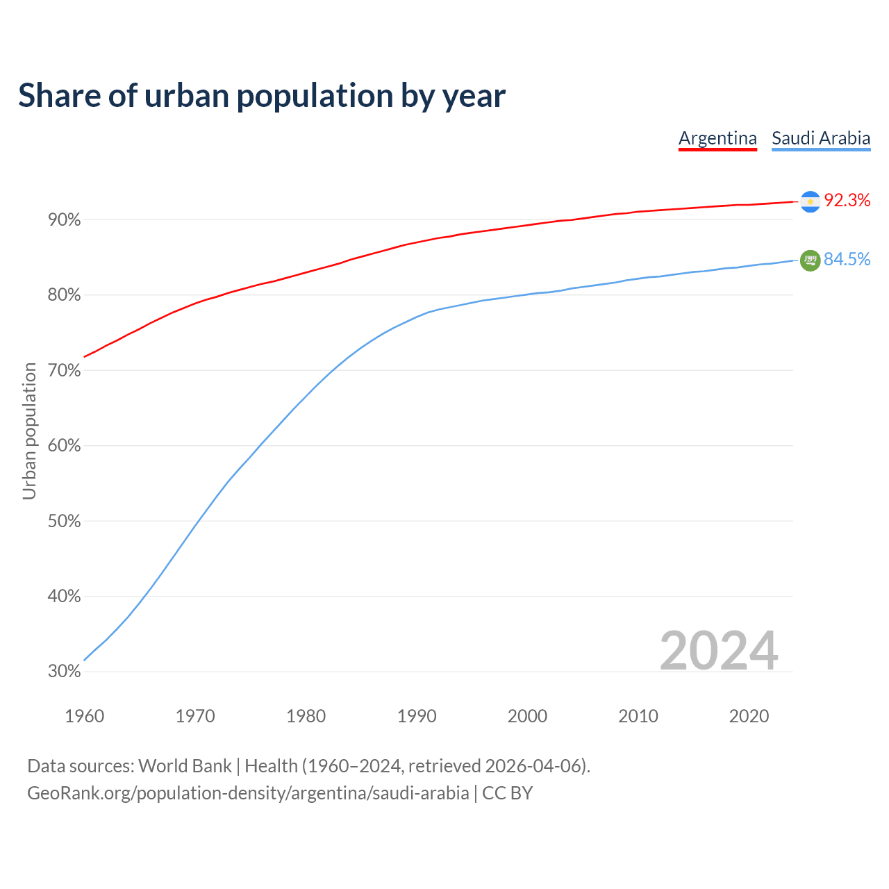 From 2004 to 2024, the share of urban population changed from 89.9% to 92.3% in Argentina and from 80.8% to 84.5% in Saudi Arabia.