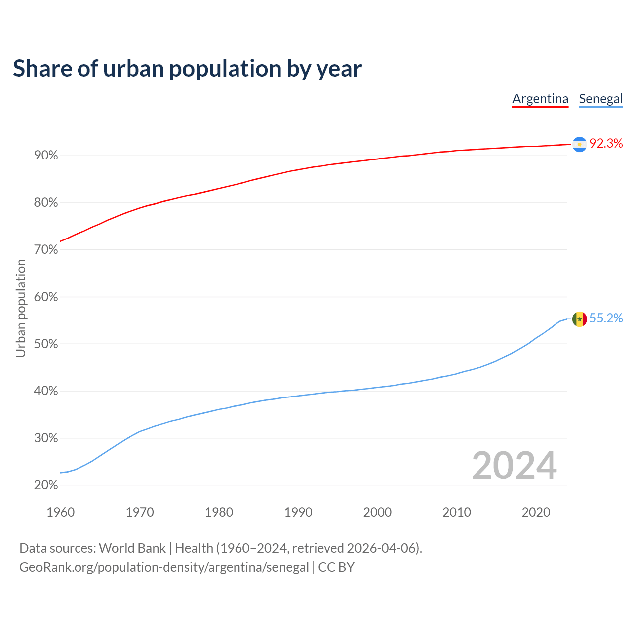From 2004 to 2024, the share of urban population changed from 89.9% to 92.3% in Argentina and from 41.6% to 55.2% in Senegal.