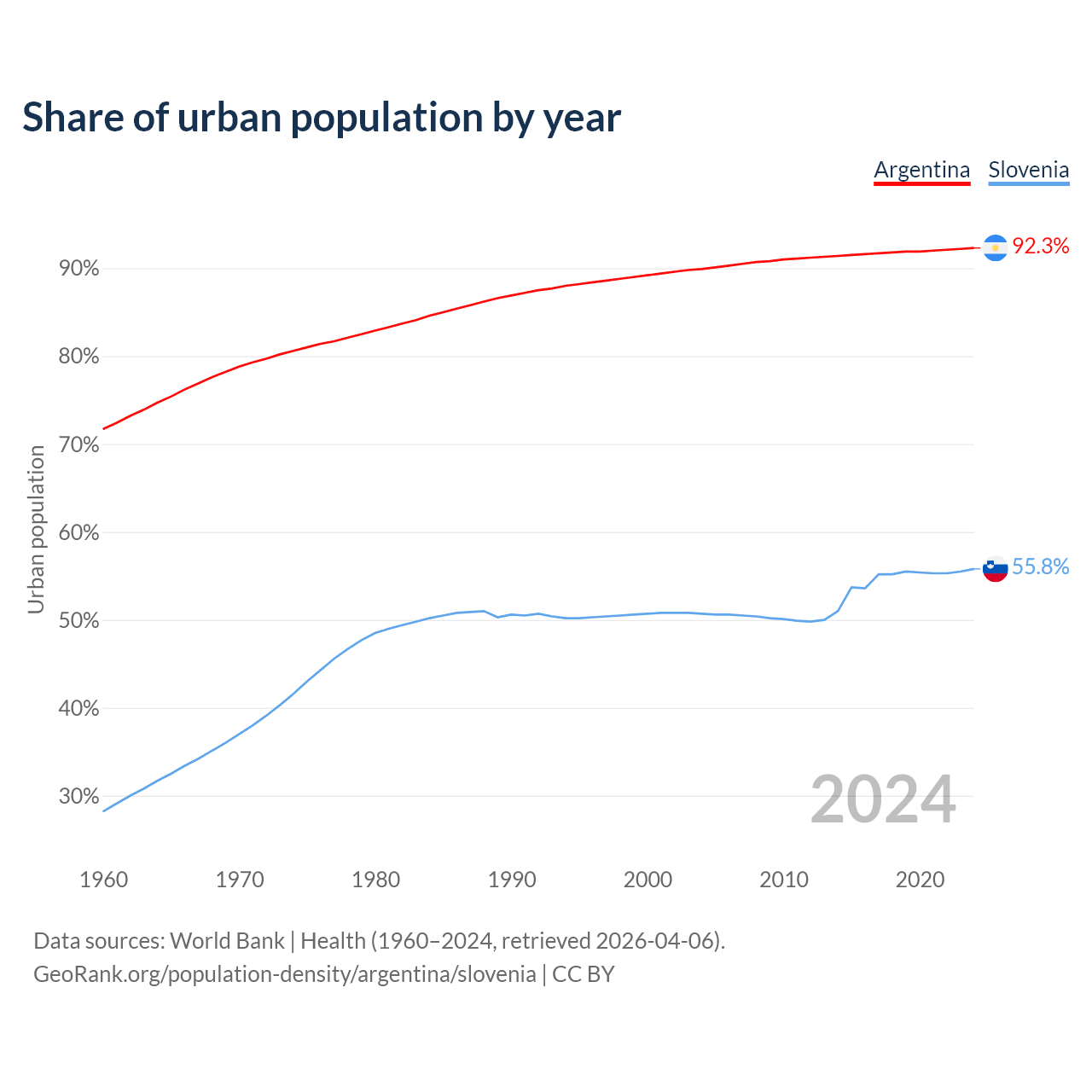 From 2004 to 2024, the share of urban population changed from 89.9% to 92.3% in Argentina and from 50.7% to 55.8% in Slovenia.