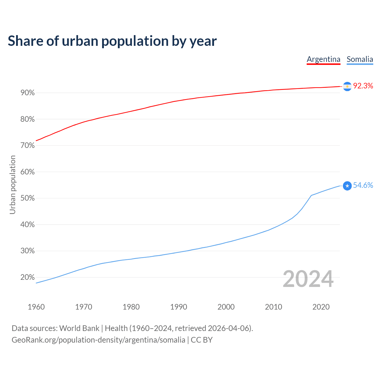 From 2004 to 2024, the share of urban population changed from 89.9% to 92.3% in Argentina and from 35% to 54.6% in Somalia.