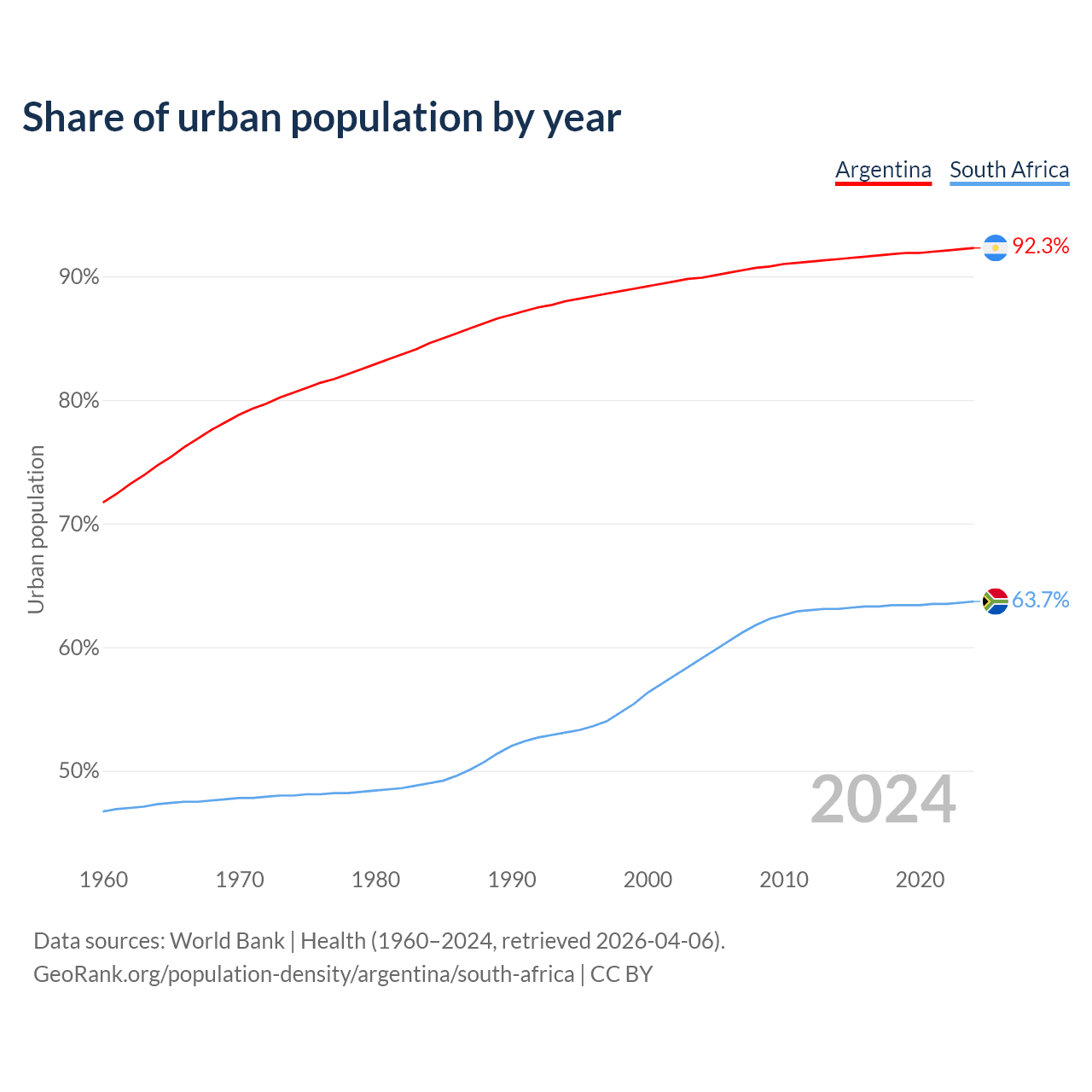 From 2004 to 2024, the share of urban population changed from 89.9% to 92.3% in Argentina and from 59.1% to 63.7% in South Africa.