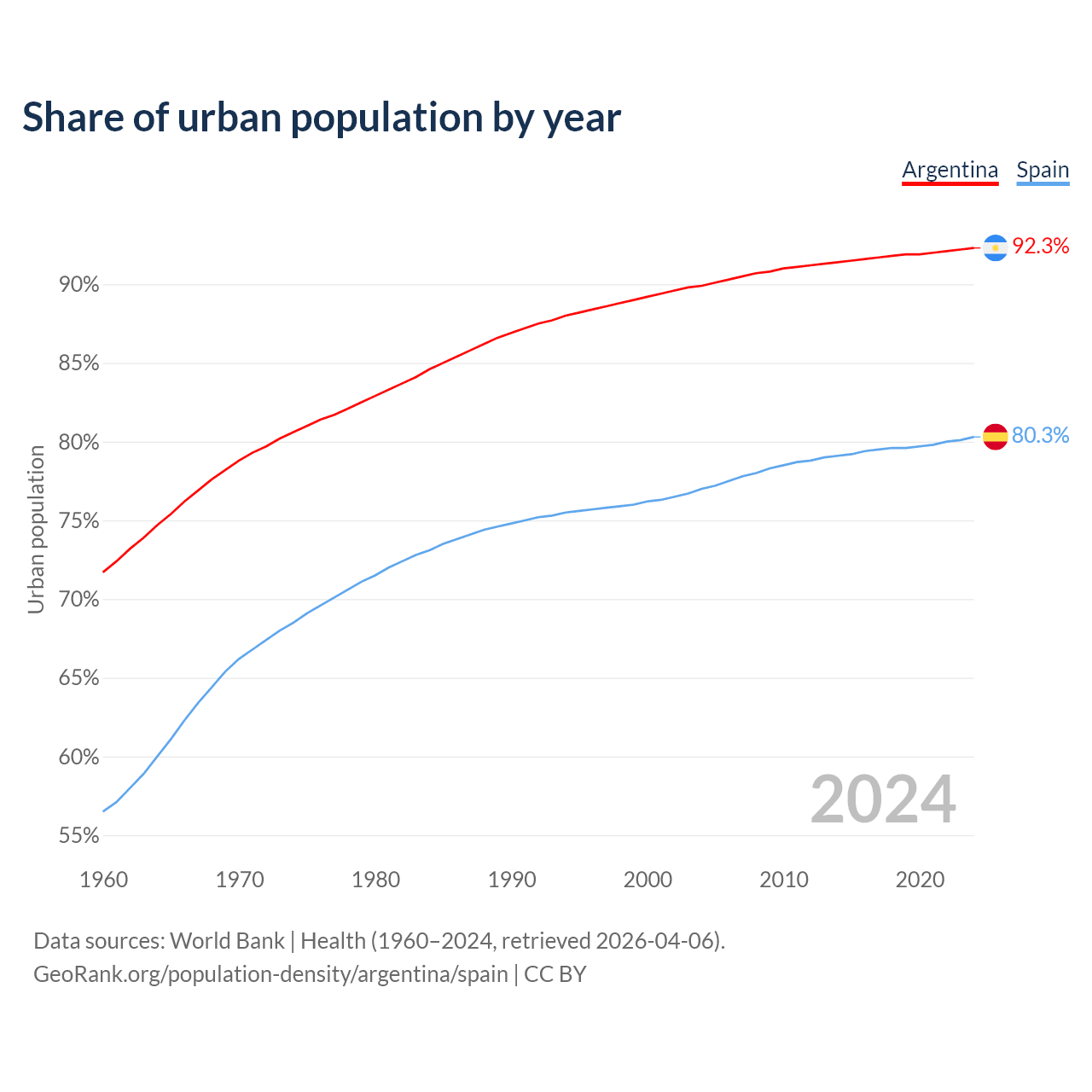 From 2004 to 2024, the share of urban population changed from 89.9% to 92.3% in Argentina and from 77% to 80.3% in Spain.