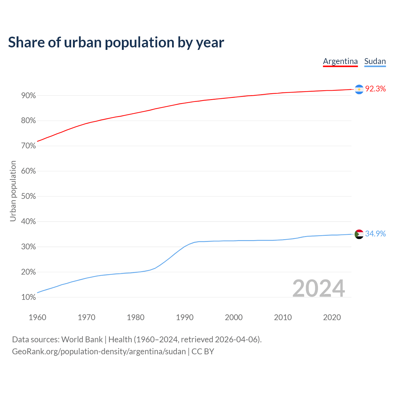 From 2004 to 2024, the share of urban population changed from 89.9% to 92.3% in Argentina and from 32.4% to 34.9% in Sudan.