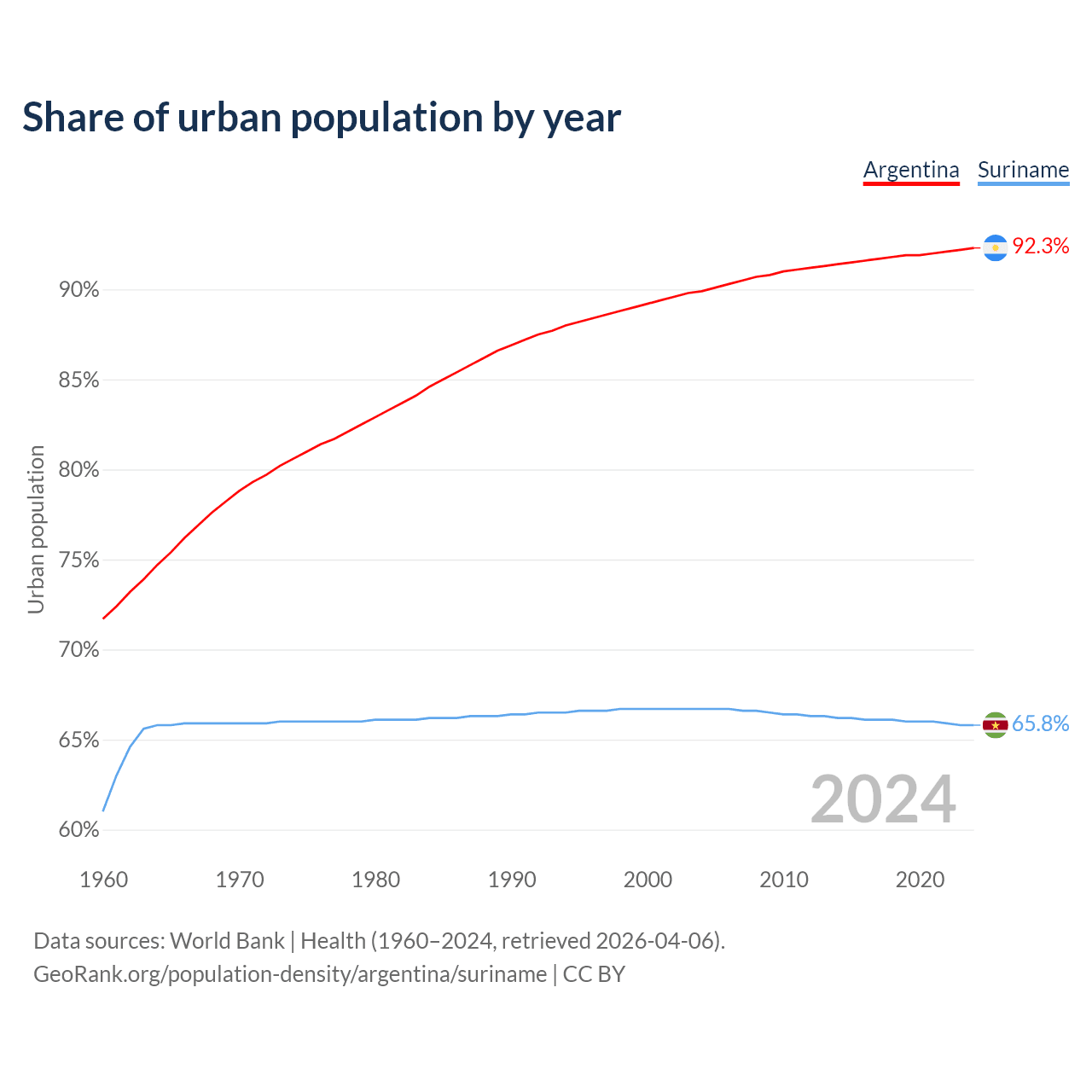 From 2004 to 2024, the share of urban population changed from 89.9% to 92.3% in Argentina and from 66.7% to 65.8% in Suriname.
