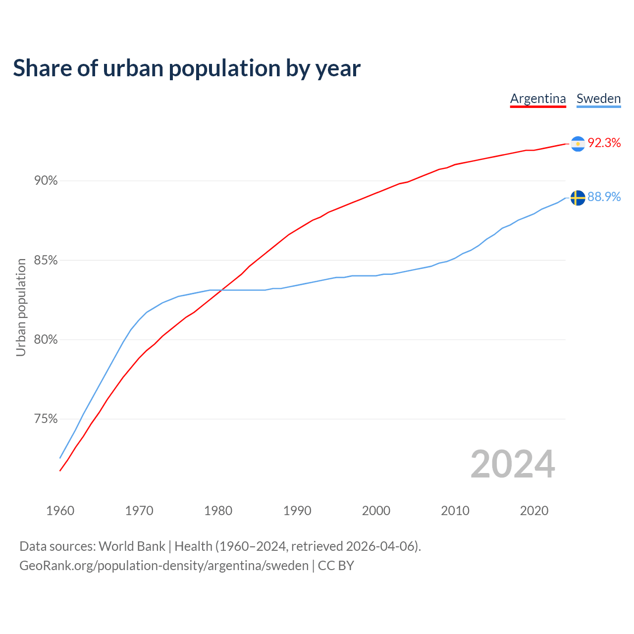 From 2004 to 2024, the share of urban population changed from 89.9% to 92.3% in Argentina and from 84.3% to 88.9% in Sweden.