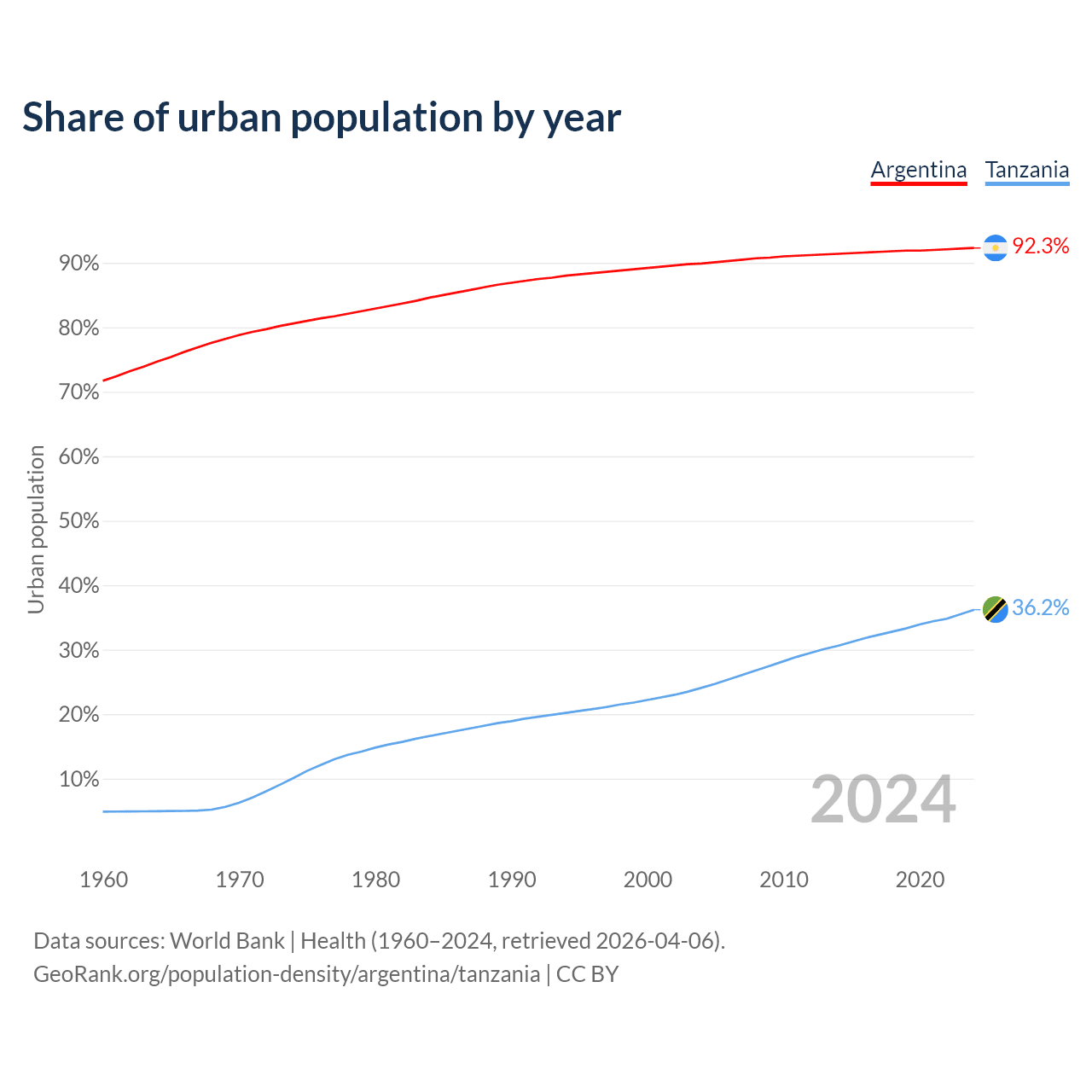 From 2004 to 2024, the share of urban population changed from 89.9% to 92.3% in Argentina and from 24.1% to 36.2% in Tanzania.
