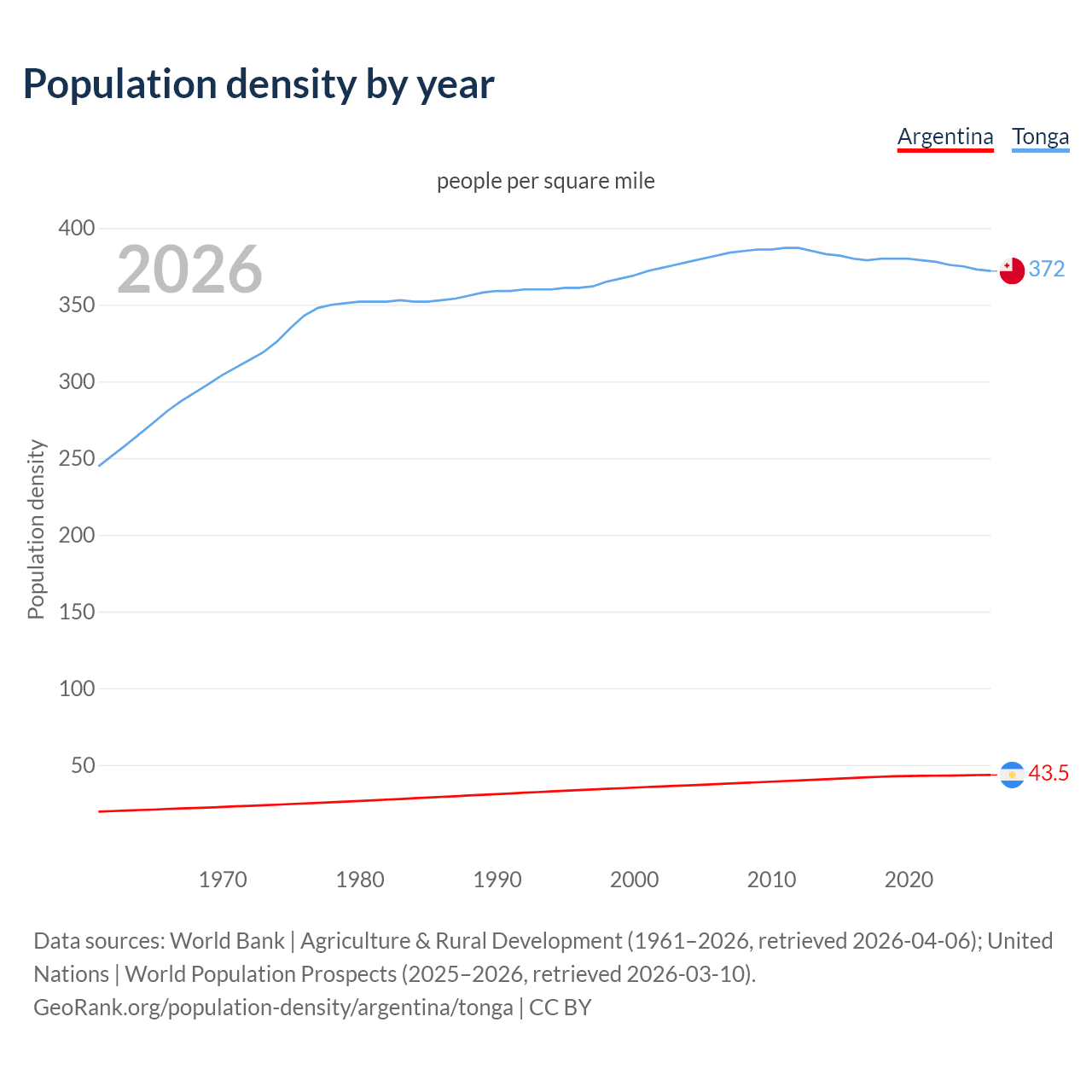 From 2006 to 2026, population density in Argentina increased by 16.1%, compared to a 2.77% decline in Tonga.