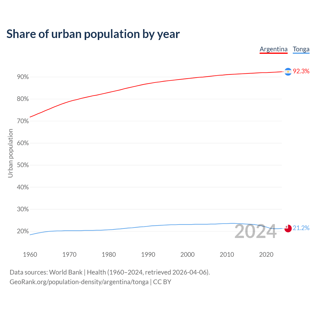 From 2004 to 2024, the share of urban population changed from 89.9% to 92.3% in Argentina and from 23.1% to 21.2% in Tonga.