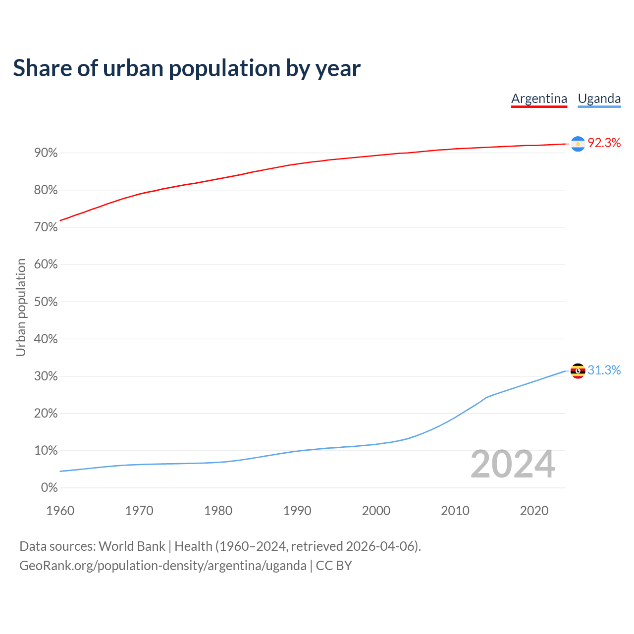 From 2004 to 2024, the share of urban population changed from 89.9% to 92.3% in Argentina and from 13.1% to 31.3% in Uganda.