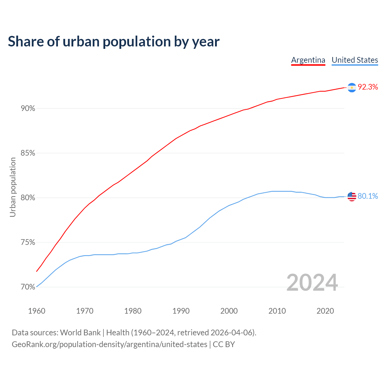 From 2004 to 2024, the share of urban population changed from 89.9% to 92.3% in Argentina and from 80% to 80.1% in the United States.
