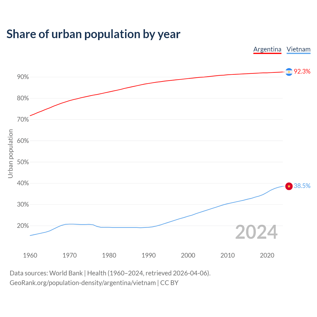 From 2004 to 2024, the share of urban population changed from 89.9% to 92.3% in Argentina and from 26.8% to 38.5% in Vietnam.