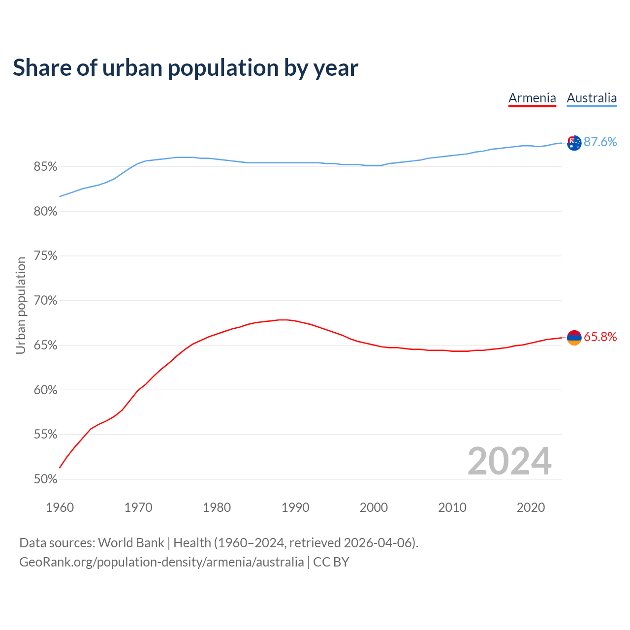 From 2004 to 2024, the share of urban population changed from 64.6% to 65.8% in Armenia and from 85.5% to 87.6% in Australia.