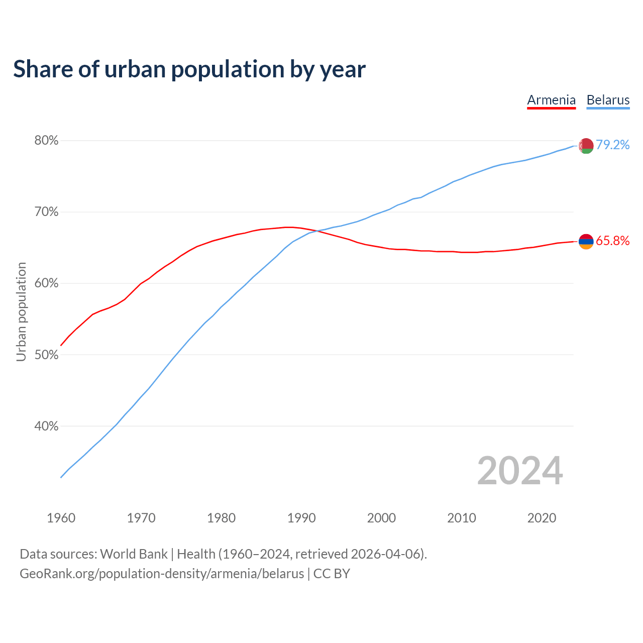 From 2004 to 2024, the share of urban population changed from 64.6% to 65.8% in Armenia and from 71.8% to 79.2% in Belarus.