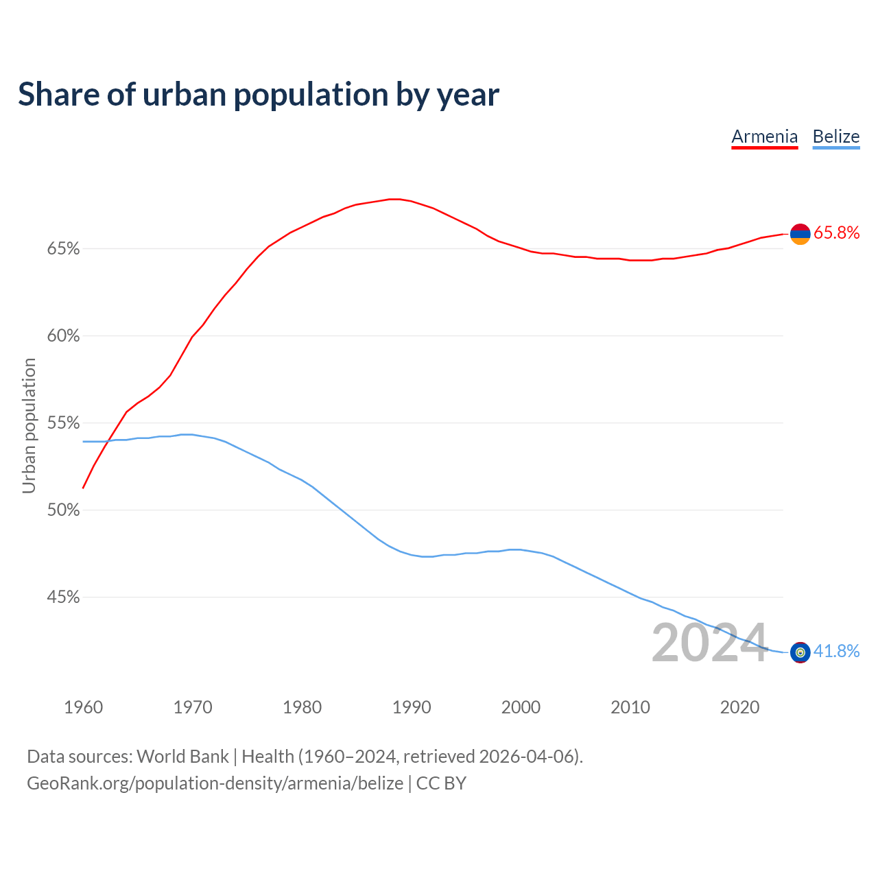 From 2004 to 2024, the share of urban population changed from 64.6% to 65.8% in Armenia and from 47% to 41.8% in Belize.