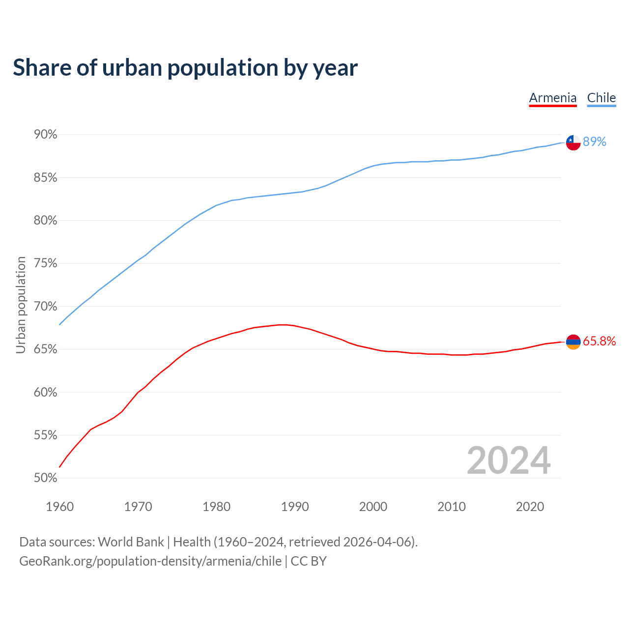 From 2004 to 2024, the share of urban population changed from 64.6% to 65.8% in Armenia and from 86.7% to 89% in Chile.