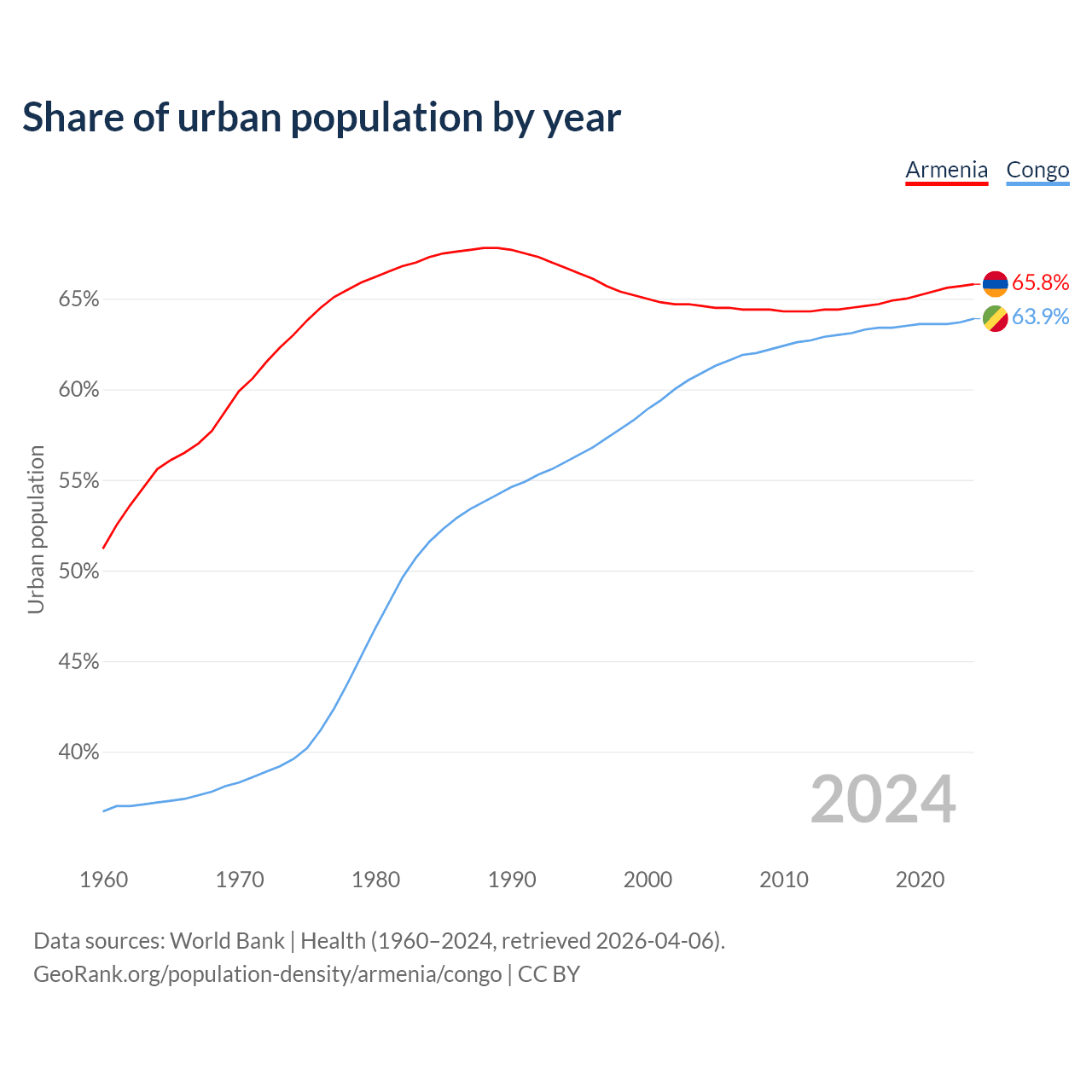 From 2004 to 2024, the share of urban population changed from 64.6% to 65.8% in Armenia and from 60.9% to 63.9% in the Congo.