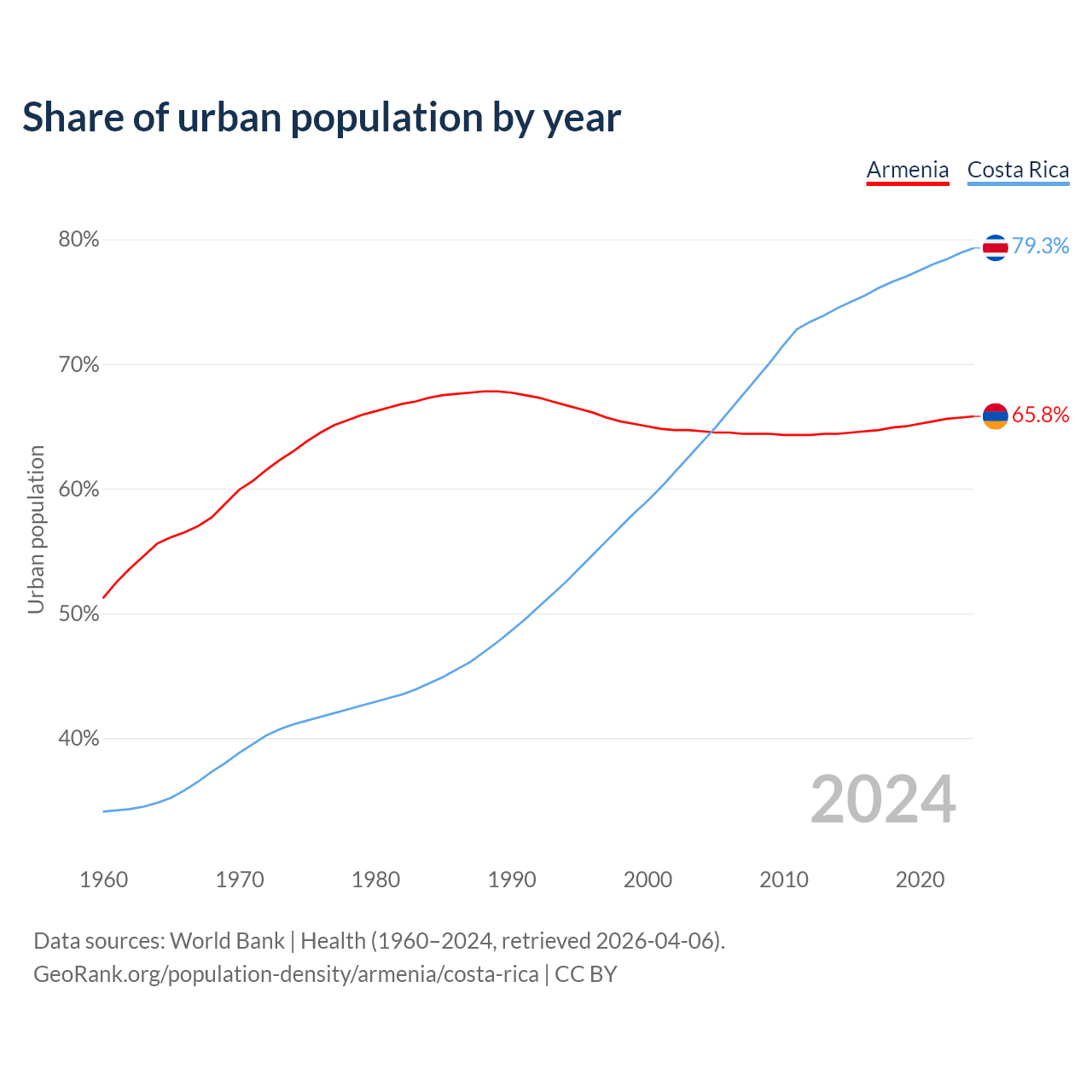 From 2004 to 2024, the share of urban population changed from 64.6% to 65.8% in Armenia and from 63.7% to 79.3% in Costa Rica.