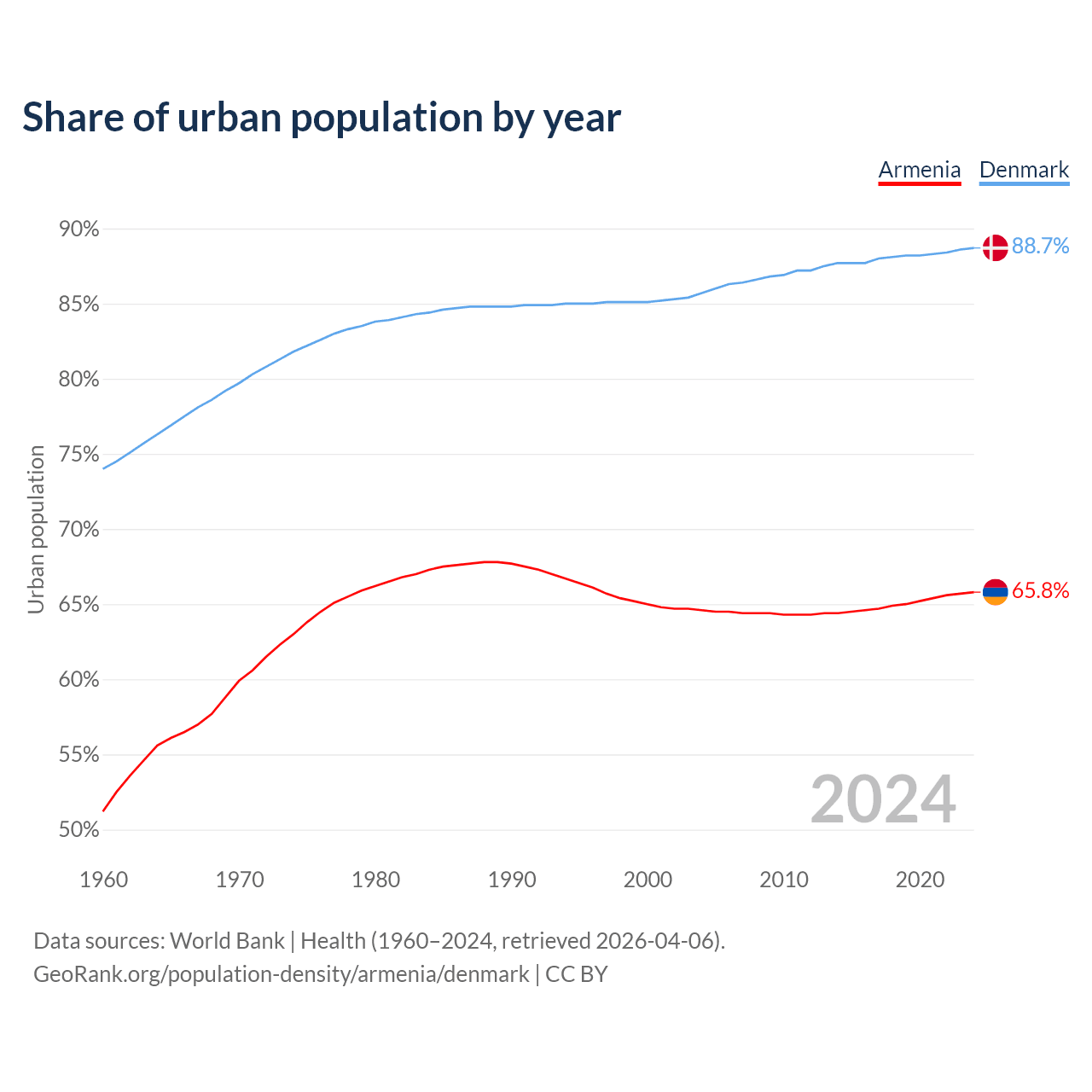 From 2004 to 2024, the share of urban population changed from 64.6% to 65.8% in Armenia and from 85.7% to 88.7% in Denmark.