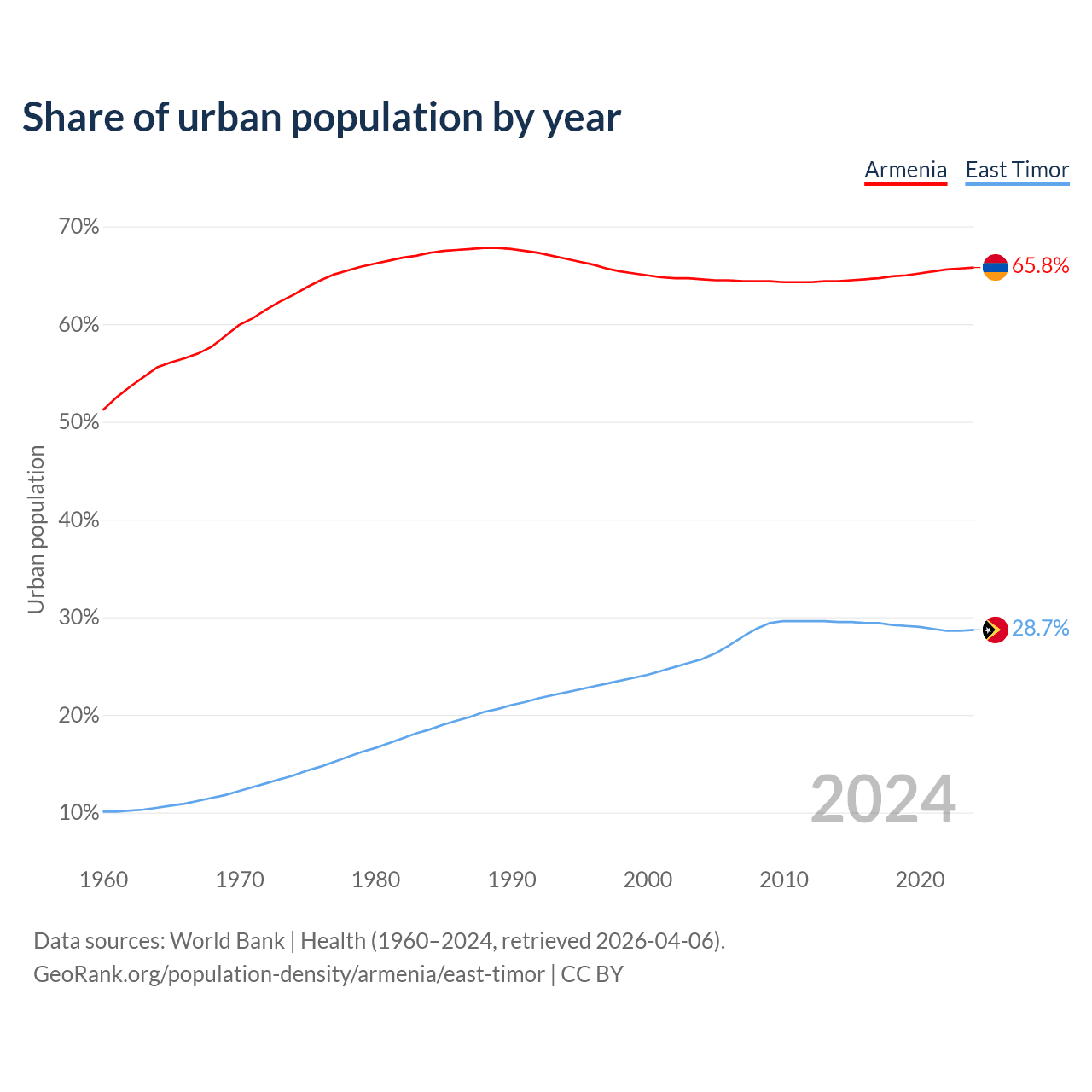 From 2004 to 2024, the share of urban population changed from 64.6% to 65.8% in Armenia and from 25.7% to 28.7% in East Timor.