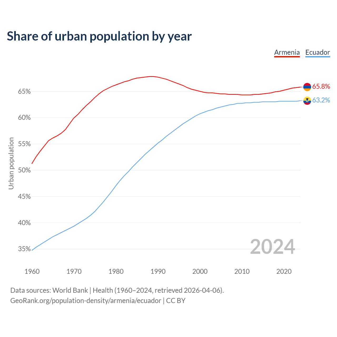 From 2004 to 2024, the share of urban population changed from 64.6% to 65.8% in Armenia and from 61.8% to 63.2% in Ecuador.