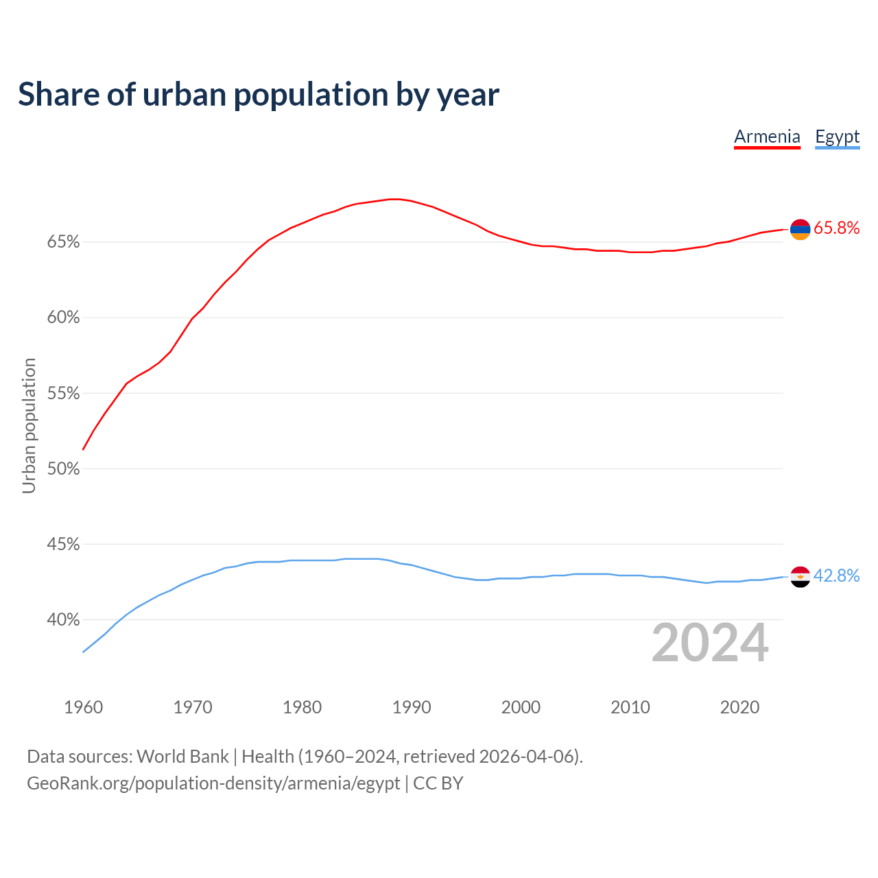 From 2006 to 2026, population density in Armenia decreased by 3.47%, compared to a 45.4% growth in Egypt.
