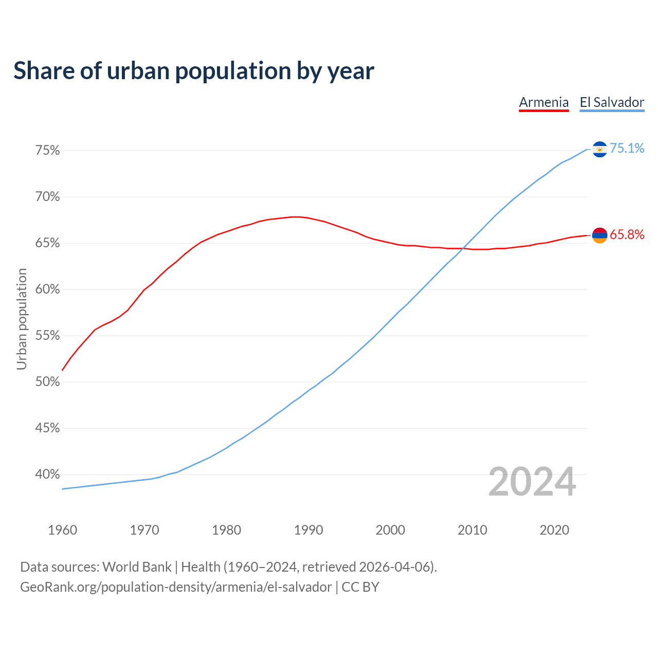 From 2004 to 2024, the share of urban population changed from 64.6% to 65.8% in Armenia and from 60.1% to 75.1% in El Salvador.