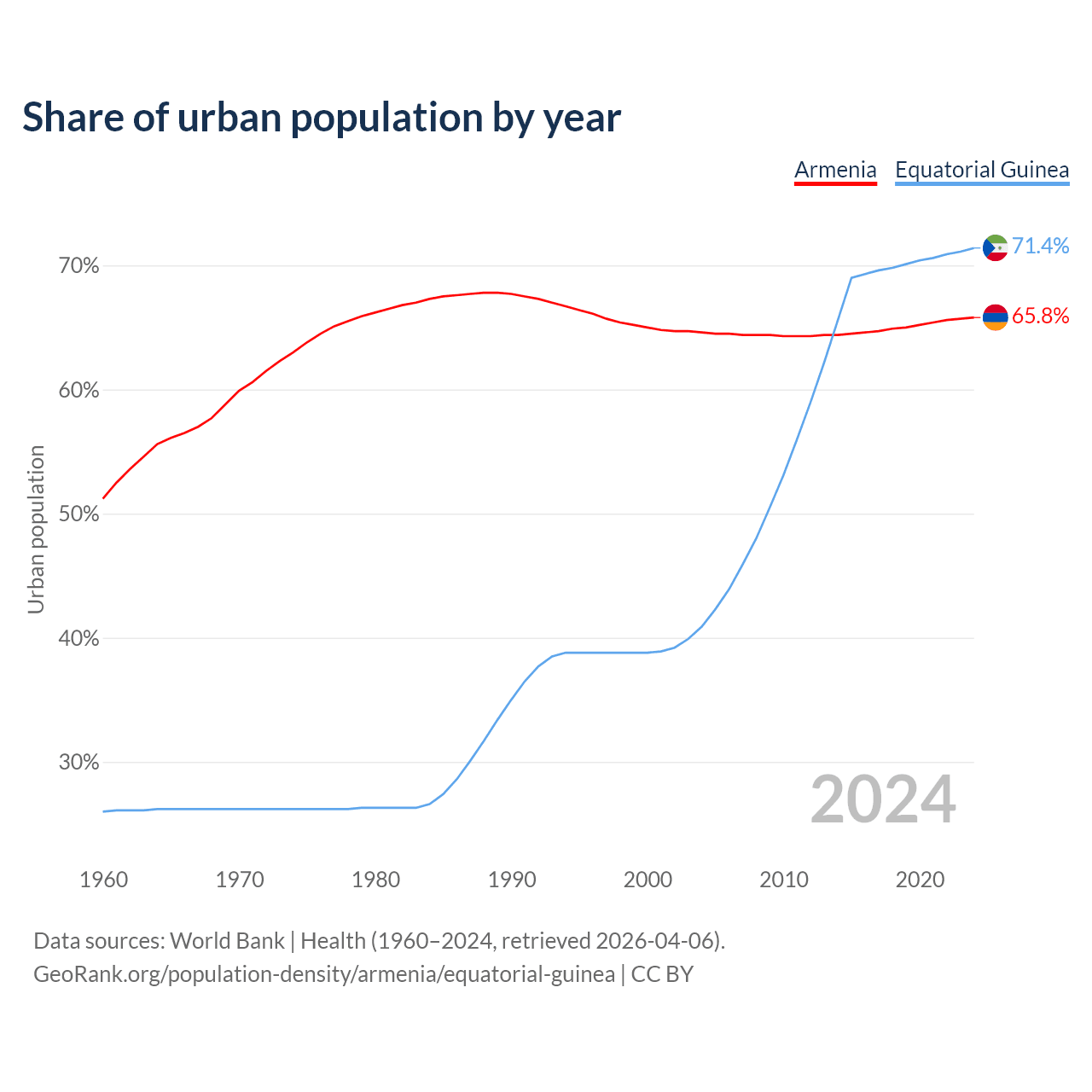 From 2004 to 2024, the share of urban population changed from 64.6% to 65.8% in Armenia and from 40.9% to 71.4% in Equatorial Guinea.