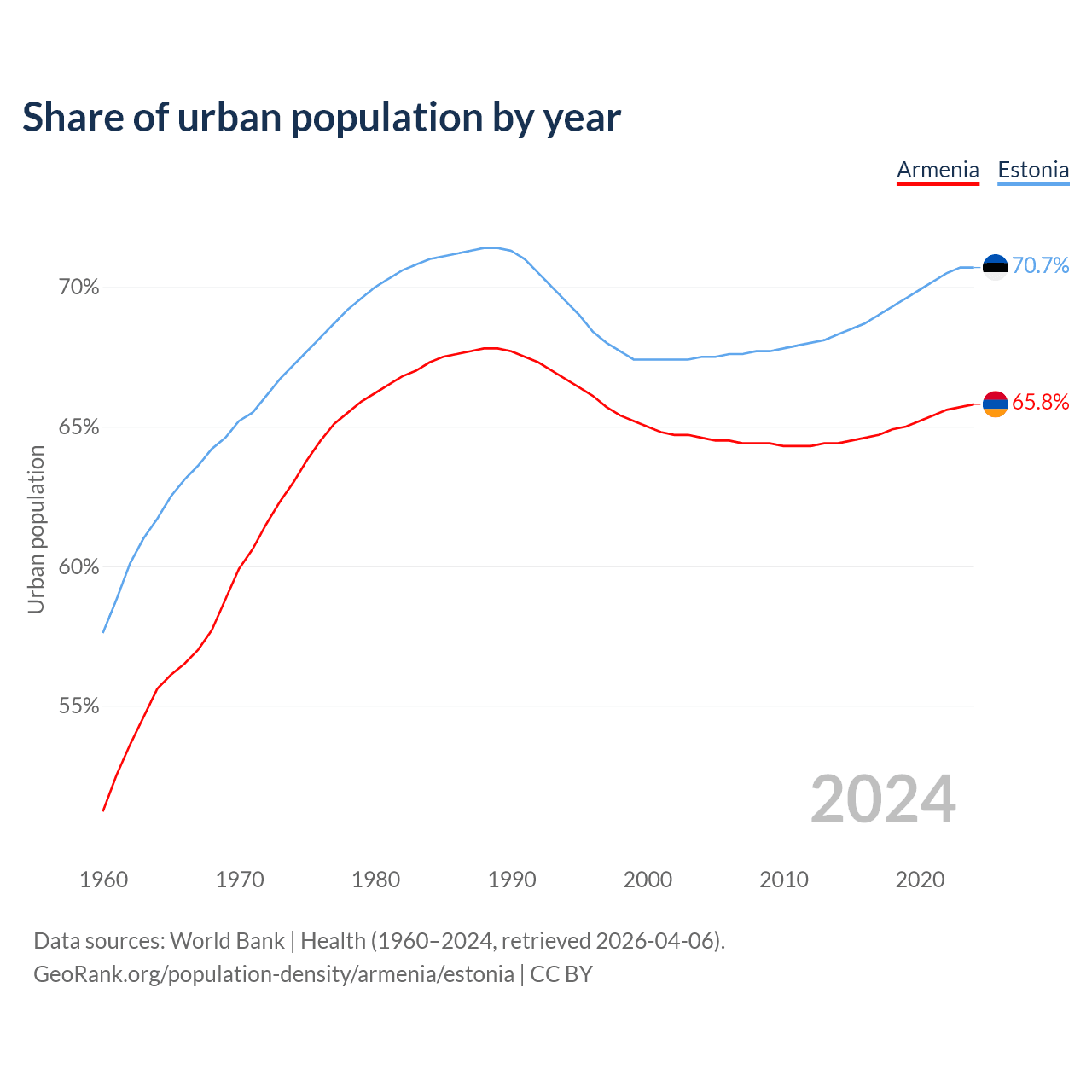 From 2004 to 2024, the share of urban population changed from 64.6% to 65.8% in Armenia and from 67.5% to 70.7% in Estonia.