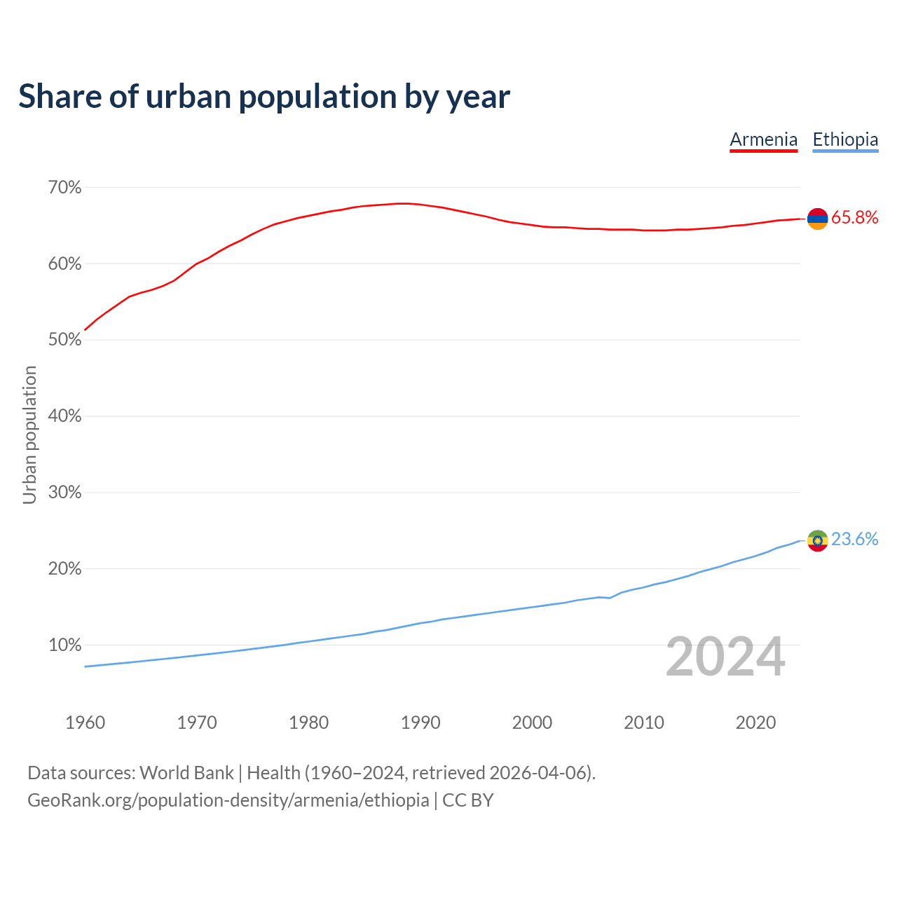 From 2006 to 2026, population density in Armenia decreased by 3.47%, compared to a 72.2% growth in Ethiopia.