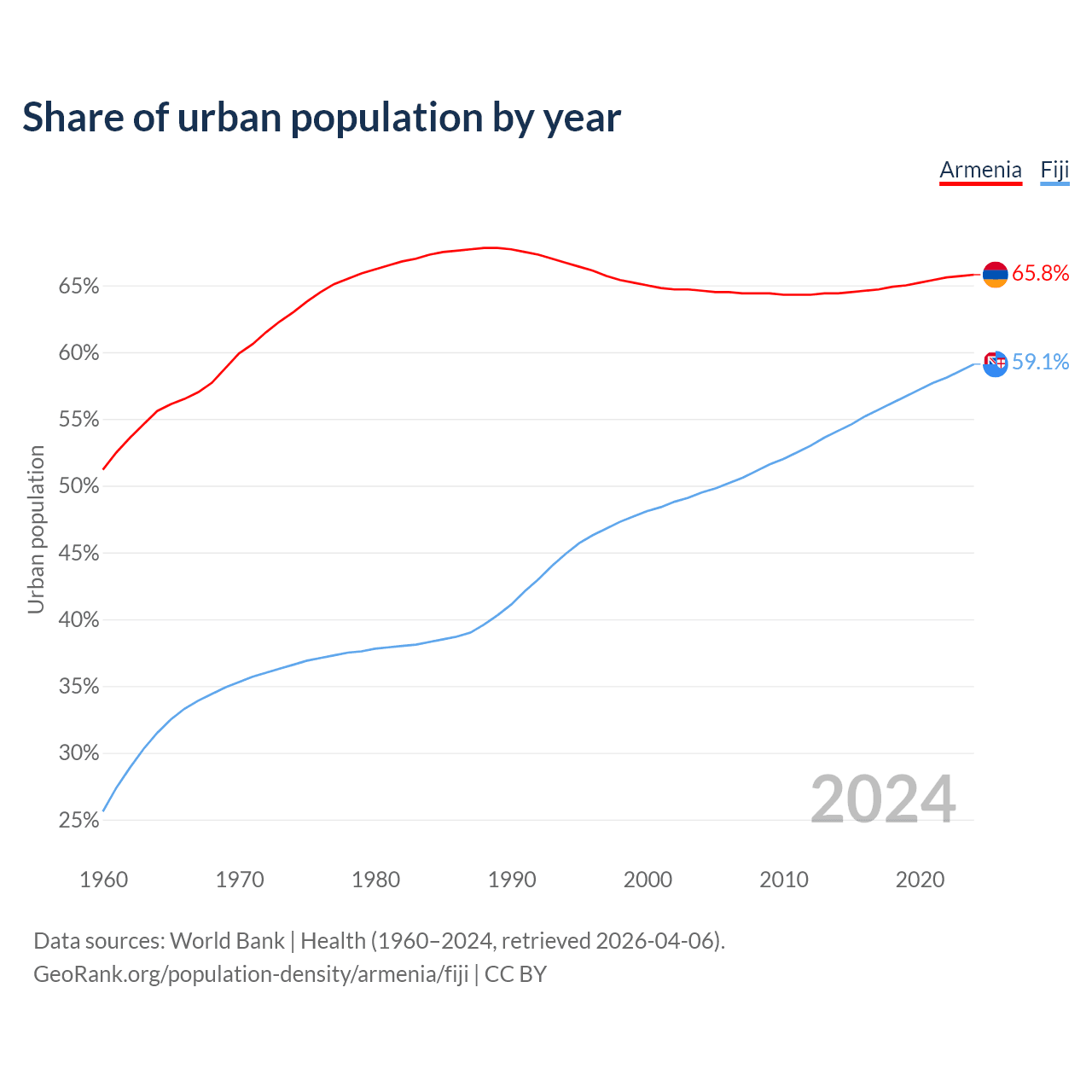 From 2004 to 2024, the share of urban population changed from 64.6% to 65.8% in Armenia and from 49.5% to 59.1% in Fiji.