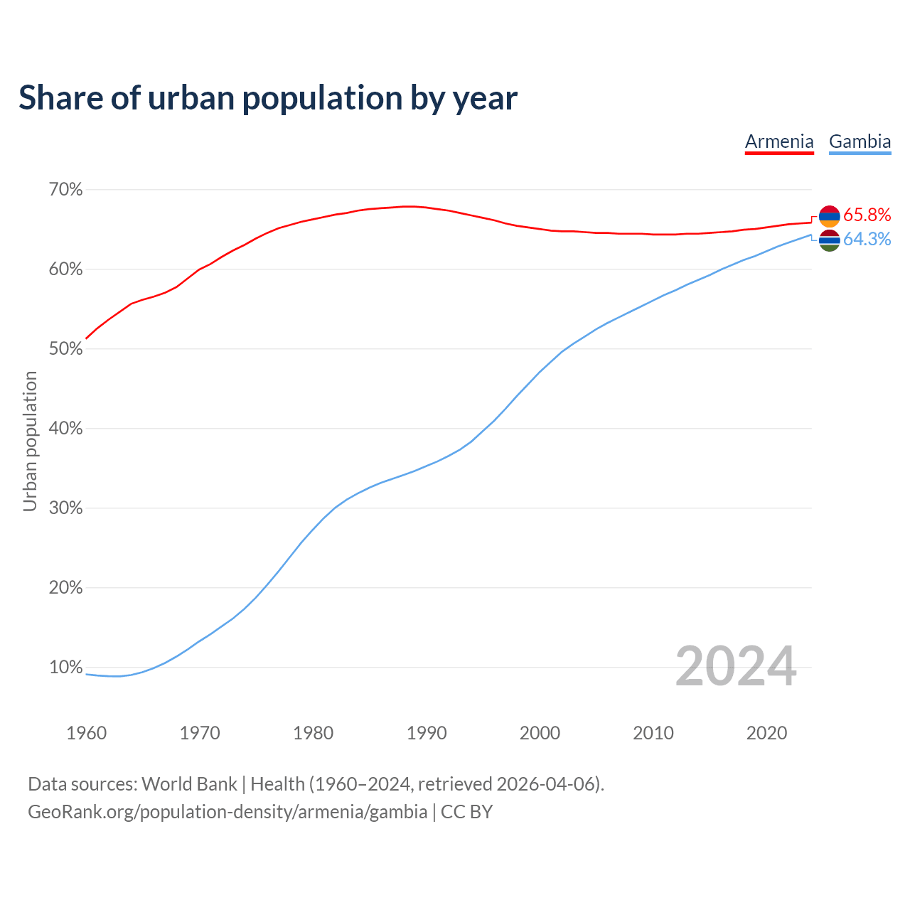 From 2004 to 2024, the share of urban population changed from 64.6% to 65.8% in Armenia and from 51.5% to 64.3% in the Gambia.
