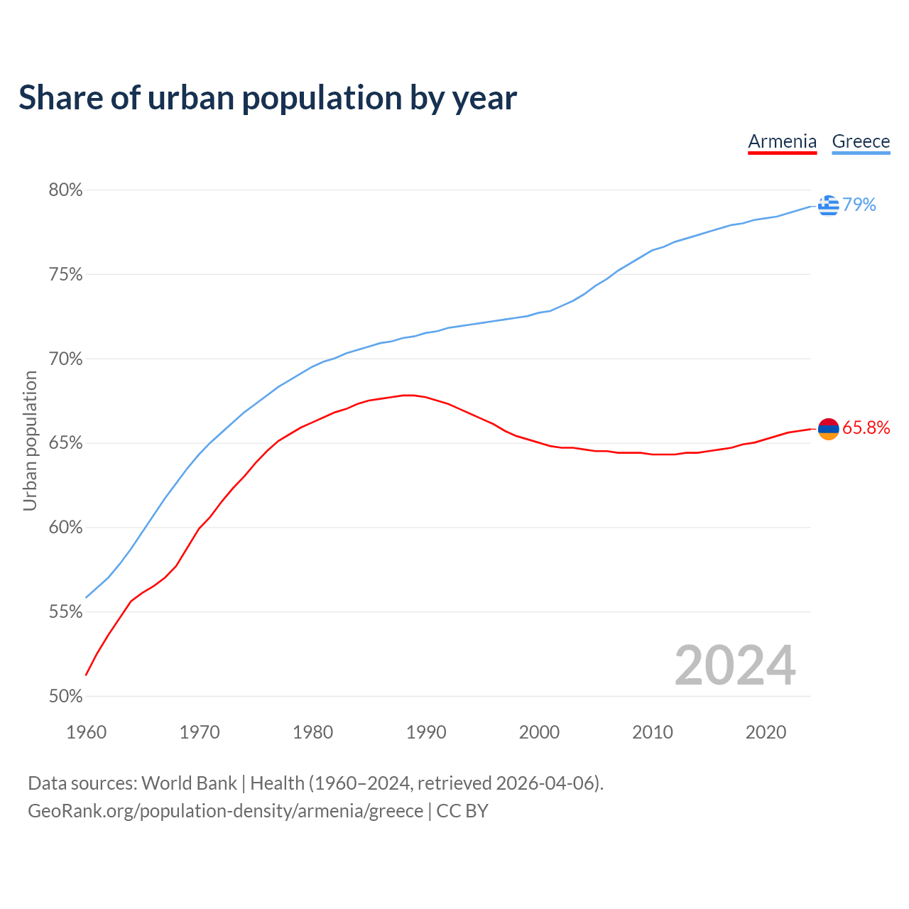 From 2004 to 2024, the share of urban population changed from 64.6% to 65.8% in Armenia and from 73.8% to 79% in Greece.