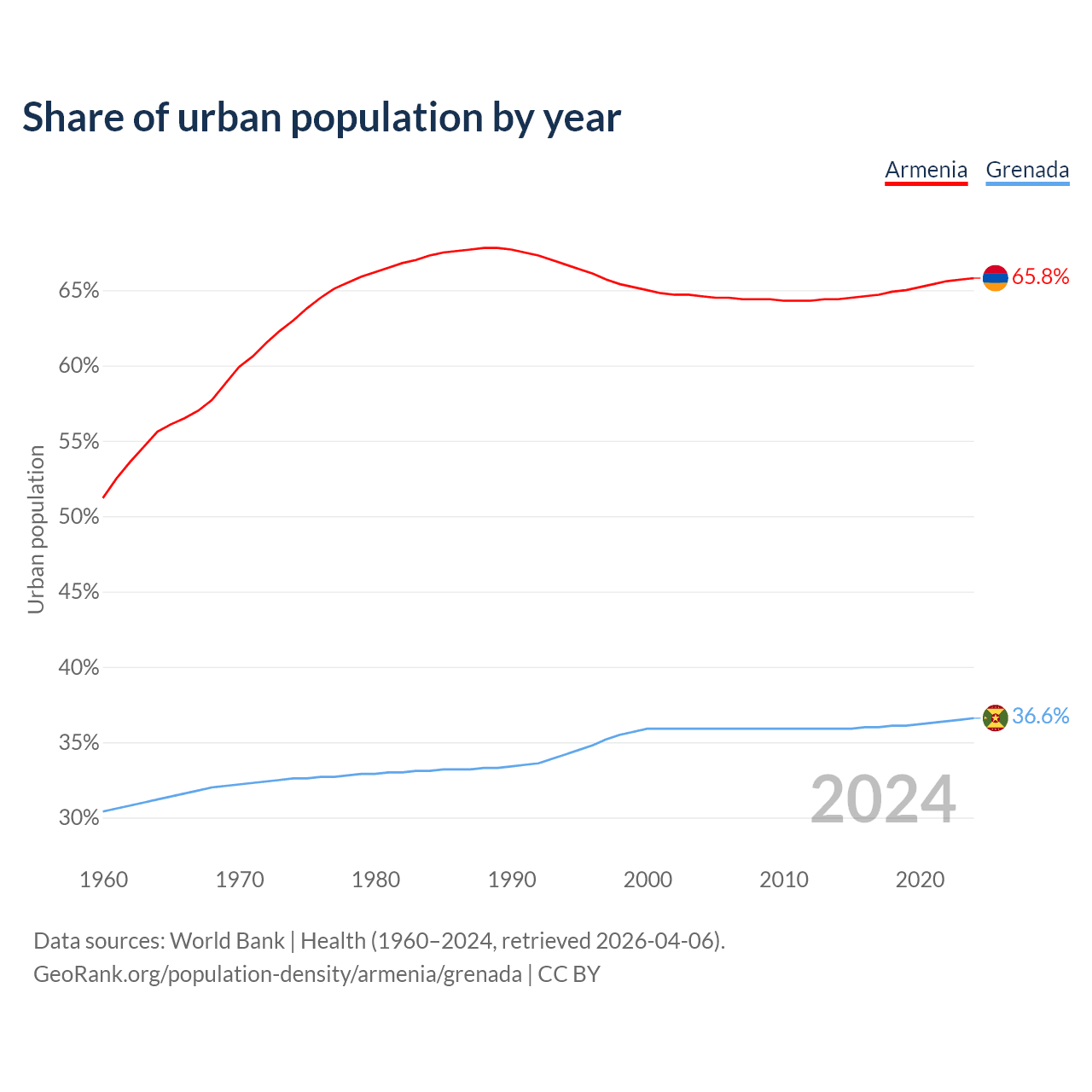 From 2004 to 2024, the share of urban population changed from 64.6% to 65.8% in Armenia and from 35.9% to 36.6% in Grenada.