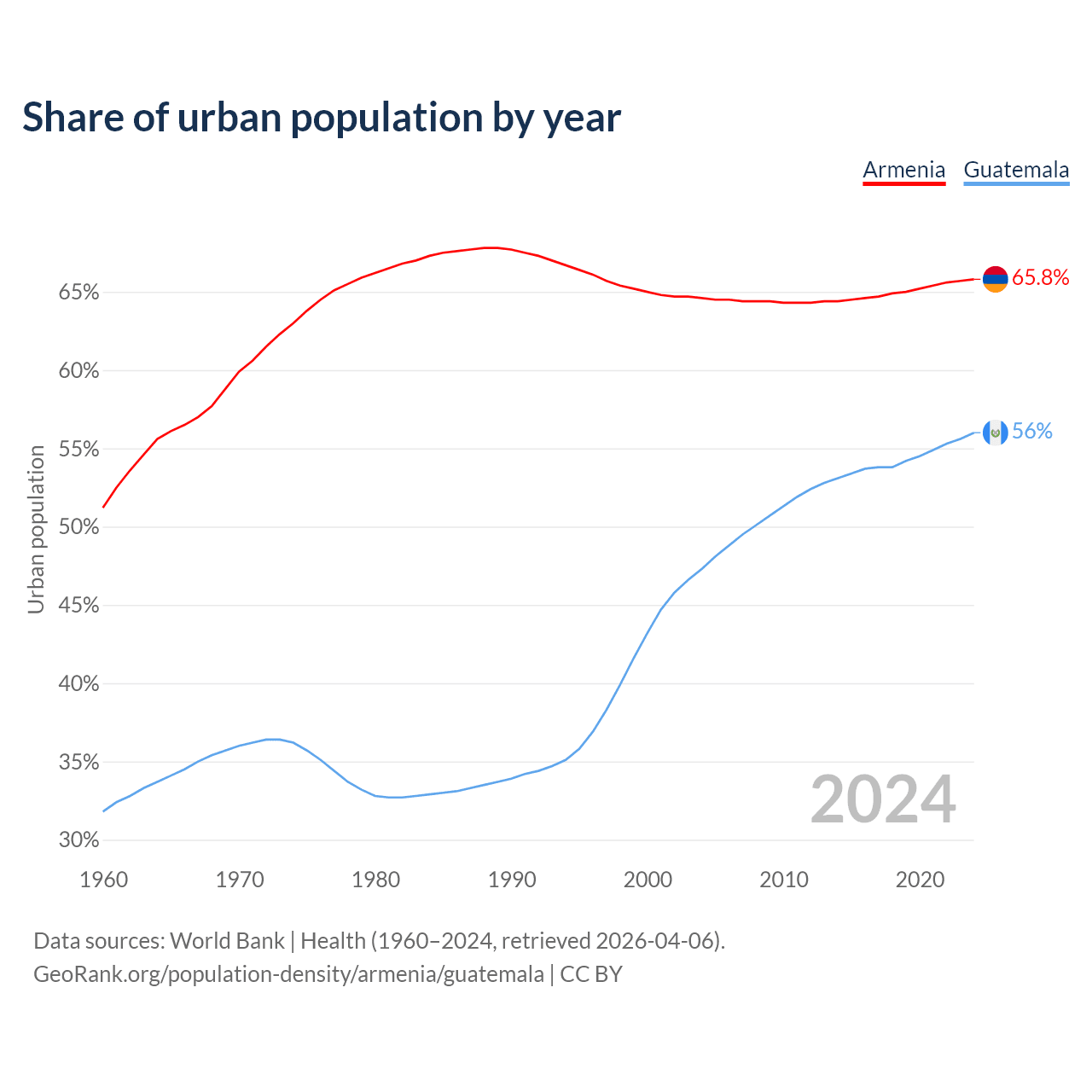 From 2004 to 2024, the share of urban population changed from 64.6% to 65.8% in Armenia and from 47.3% to 56% in Guatemala.