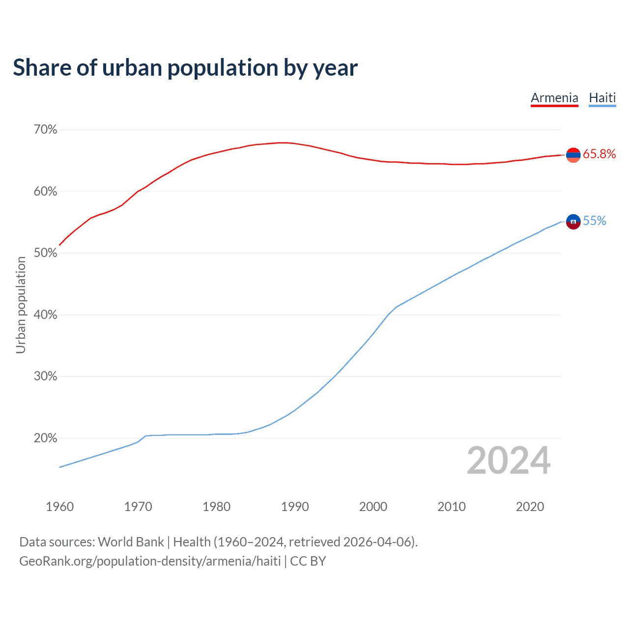 From 2004 to 2024, the share of urban population changed from 64.6% to 65.8% in Armenia and from 41.9% to 55% in Haiti.