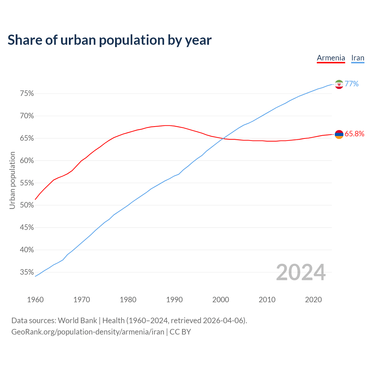 From 2004 to 2024, the share of urban population changed from 64.6% to 65.8% in Armenia and from 67.3% to 77% in Iran.