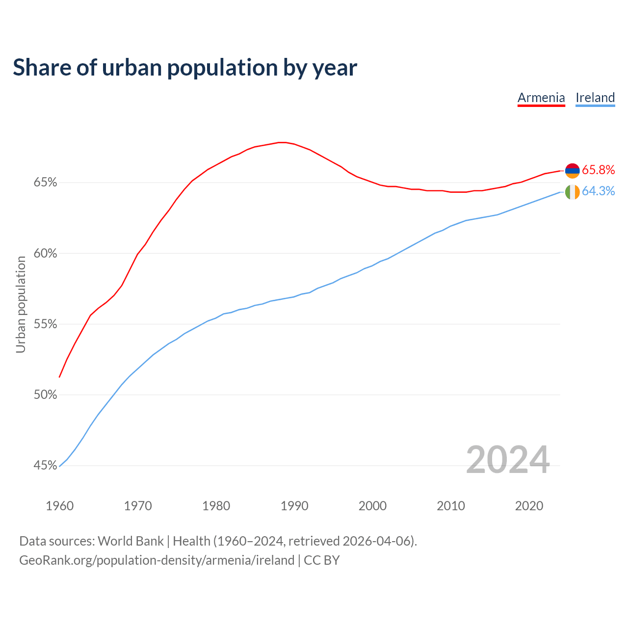 From 2004 to 2024, the share of urban population changed from 64.6% to 65.8% in Armenia and from 60.2% to 64.3% in Ireland.