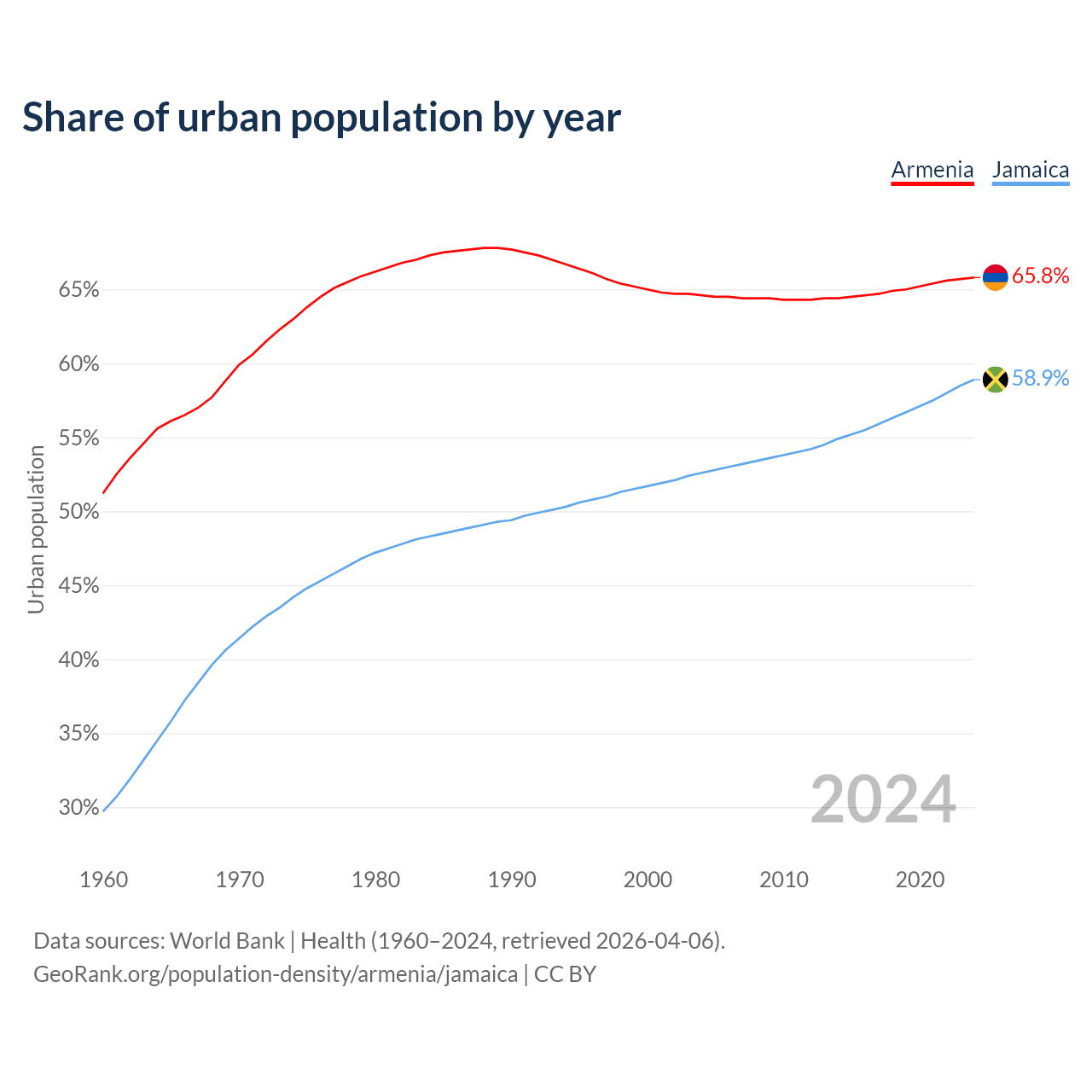 From 2006 to 2026, population density in Armenia decreased by 3.47%, compared to a 4.96% growth in Jamaica.