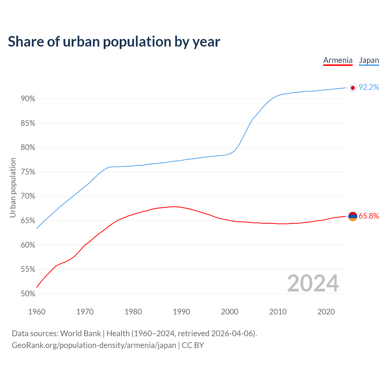 From 2004 to 2024, the share of urban population changed from 64.6% to 65.8% in Armenia and from 84.4% to 92.2% in Japan.