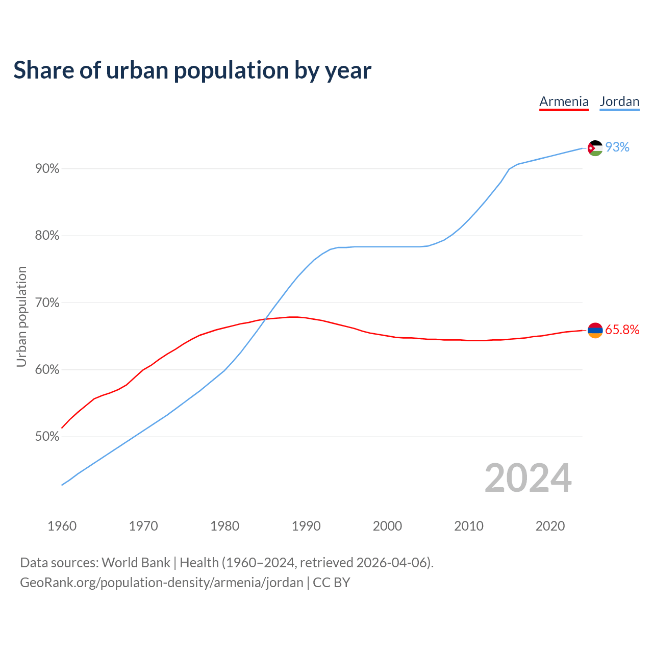 From 2004 to 2024, the share of urban population changed from 64.6% to 65.8% in Armenia and from 78.3% to 93% in Jordan.