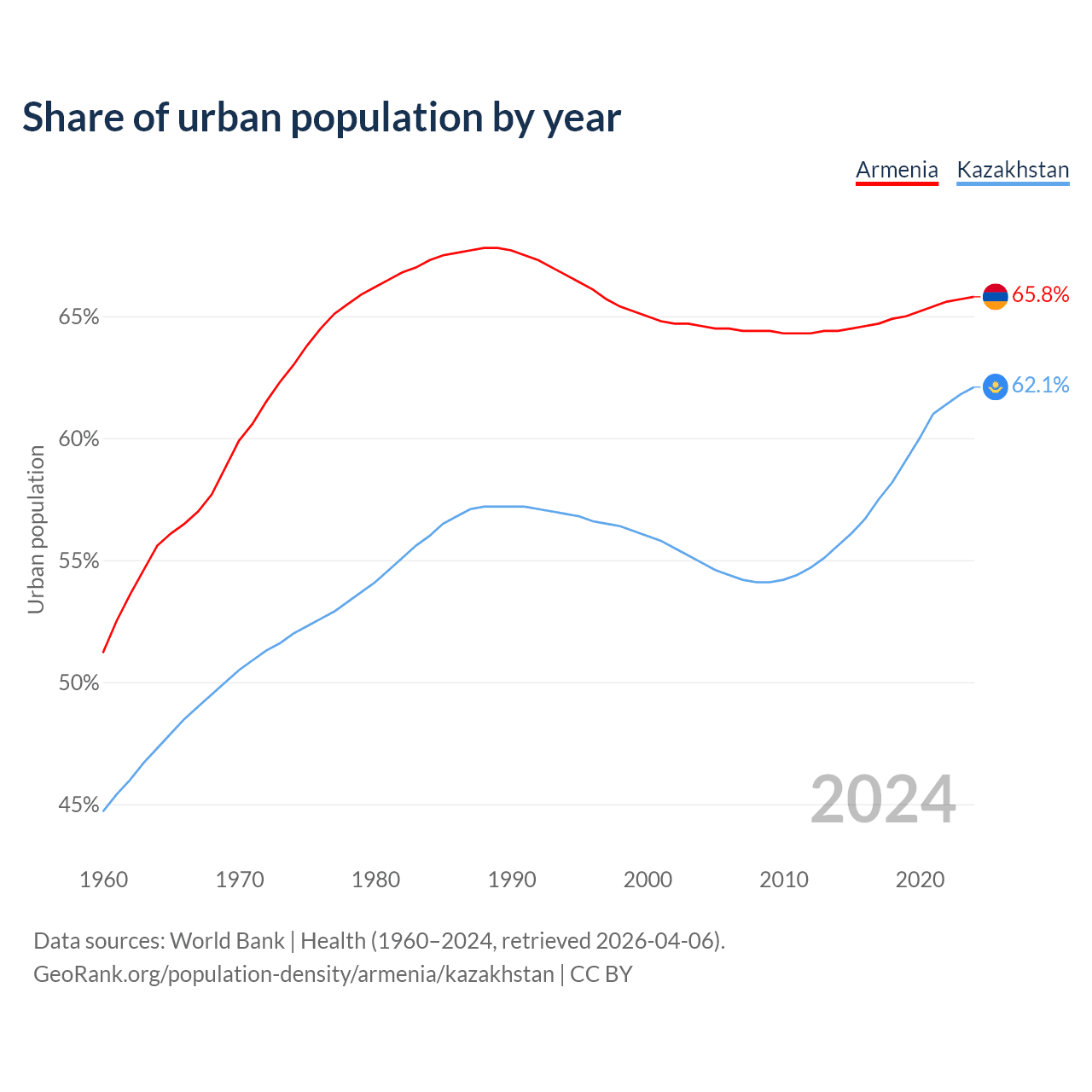 From 2004 to 2024, the share of urban population changed from 64.6% to 65.8% in Armenia and from 54.9% to 62.1% in Kazakhstan.