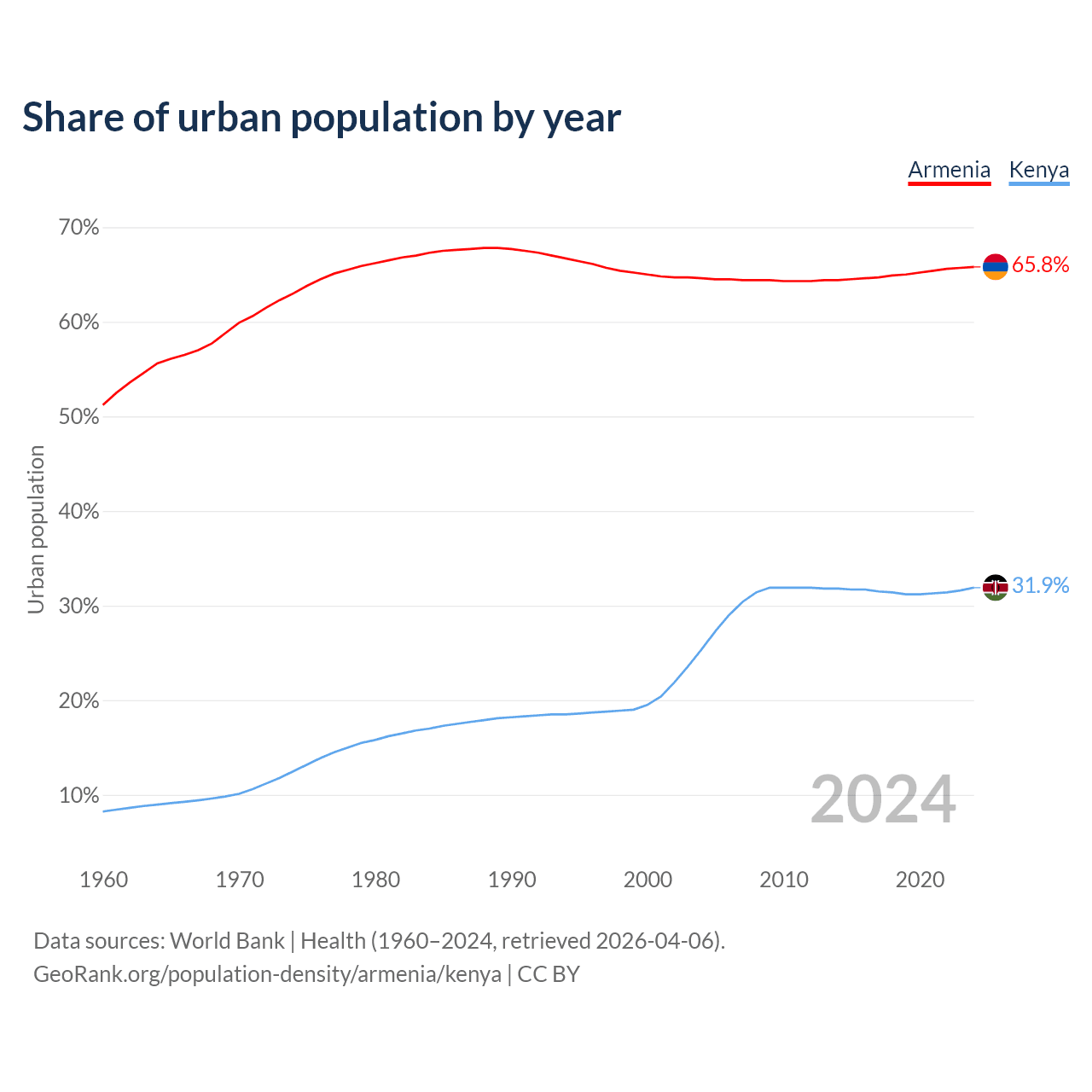 From 2004 to 2024, the share of urban population changed from 64.6% to 65.8% in Armenia and from 25.4% to 31.9% in Kenya.