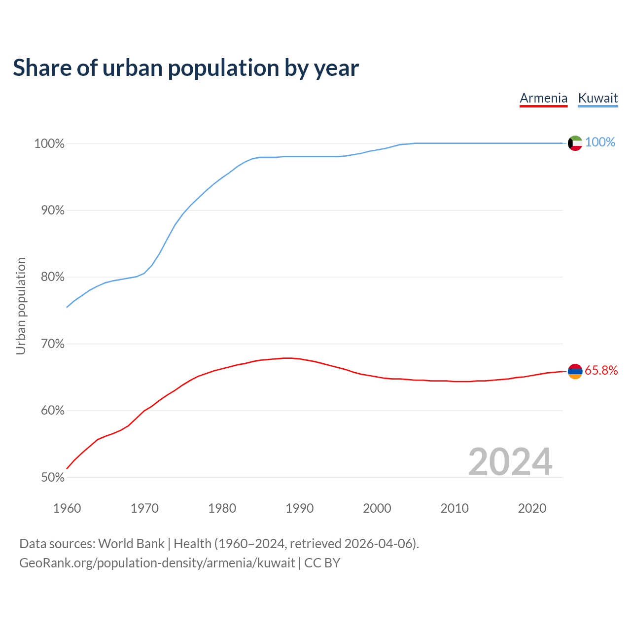 From 2004 to 2024, the share of urban population changed from 64.6% to 65.8% in Armenia and from 99.9% to 100% in Kuwait.