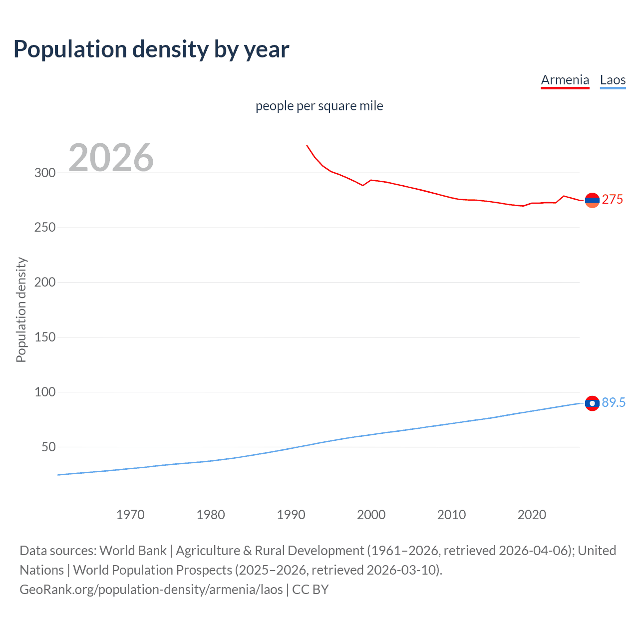 From 2006 to 2026, population density in Armenia decreased by 3.47%, compared to a 33.8% growth in Laos.