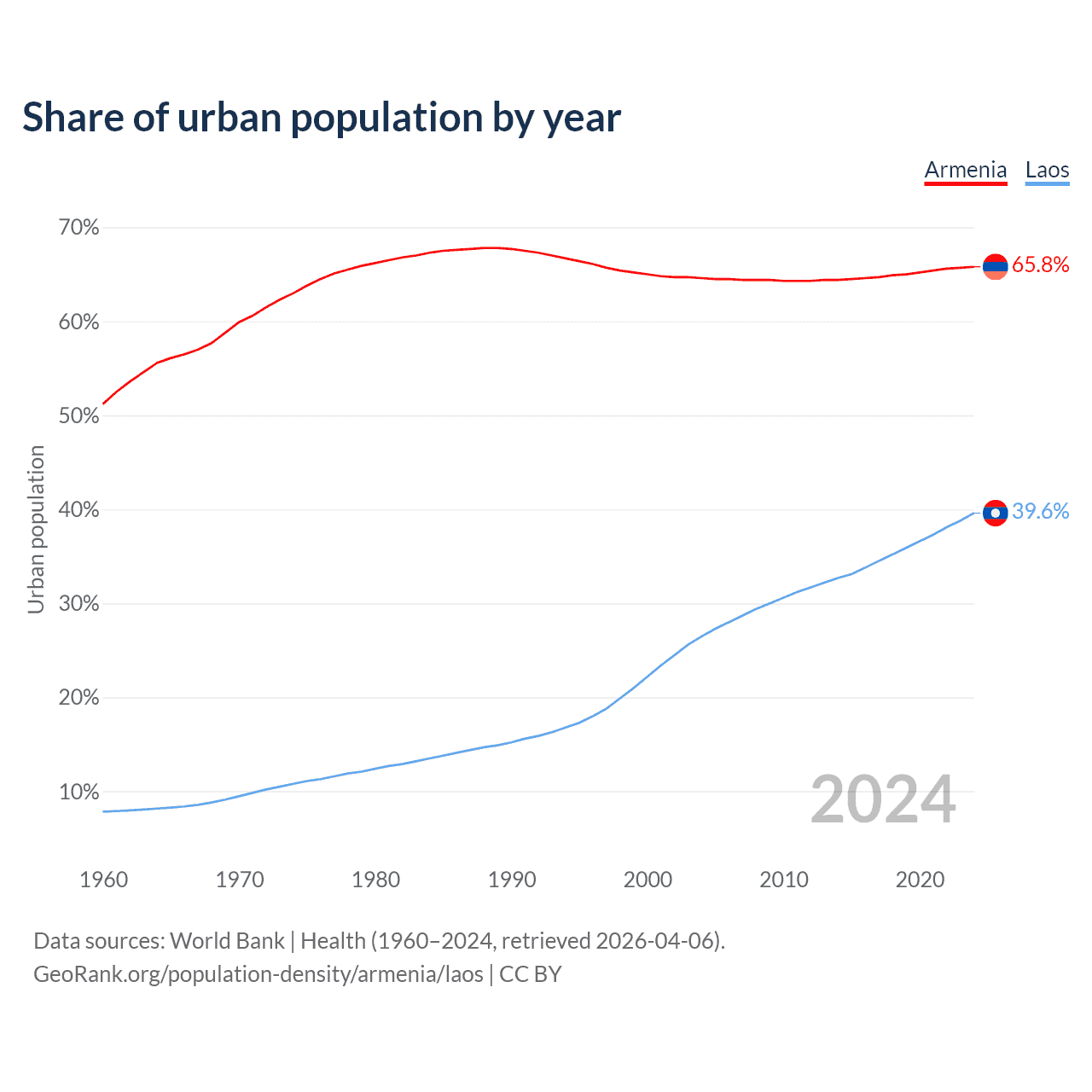 From 2004 to 2024, the share of urban population changed from 64.6% to 65.8% in Armenia and from 26.5% to 39.6% in Laos.