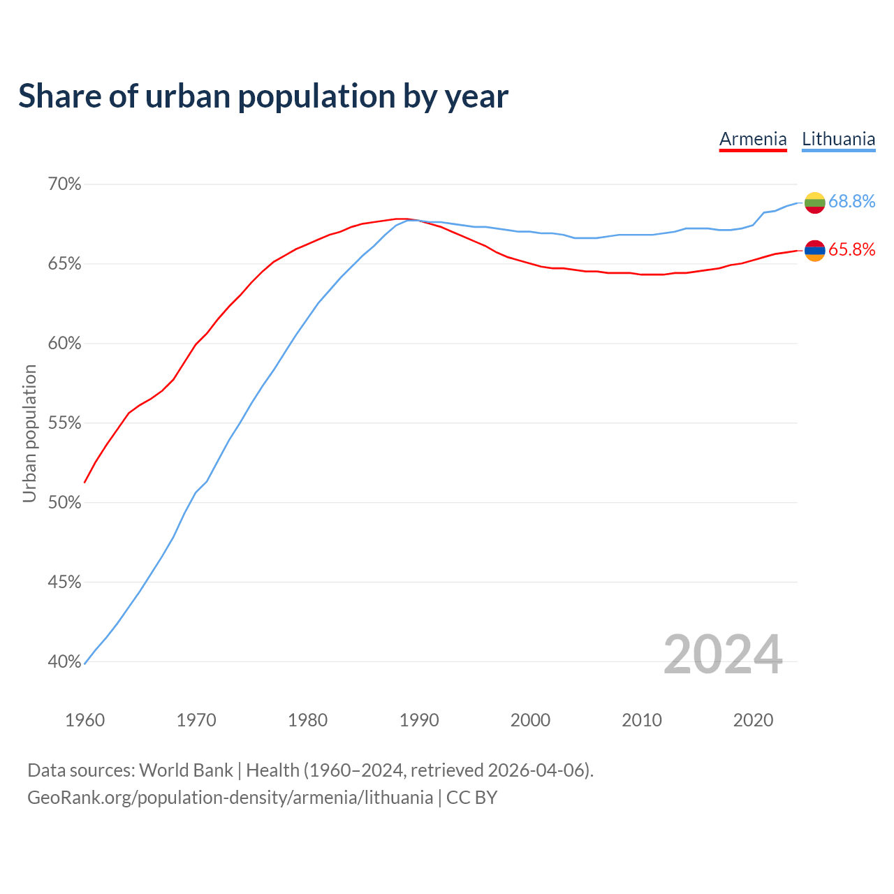 From 2004 to 2024, the share of urban population changed from 64.6% to 65.8% in Armenia and from 66.6% to 68.8% in Lithuania.