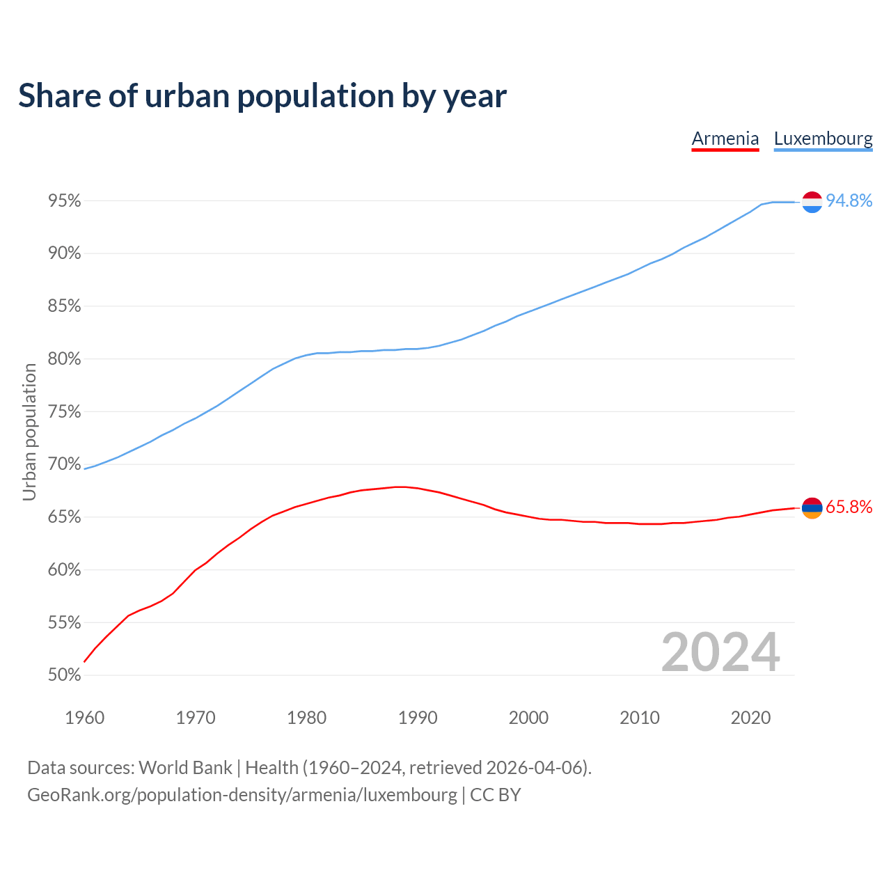 From 2004 to 2024, the share of urban population changed from 64.6% to 65.8% in Armenia and from 86% to 94.8% in Luxembourg.