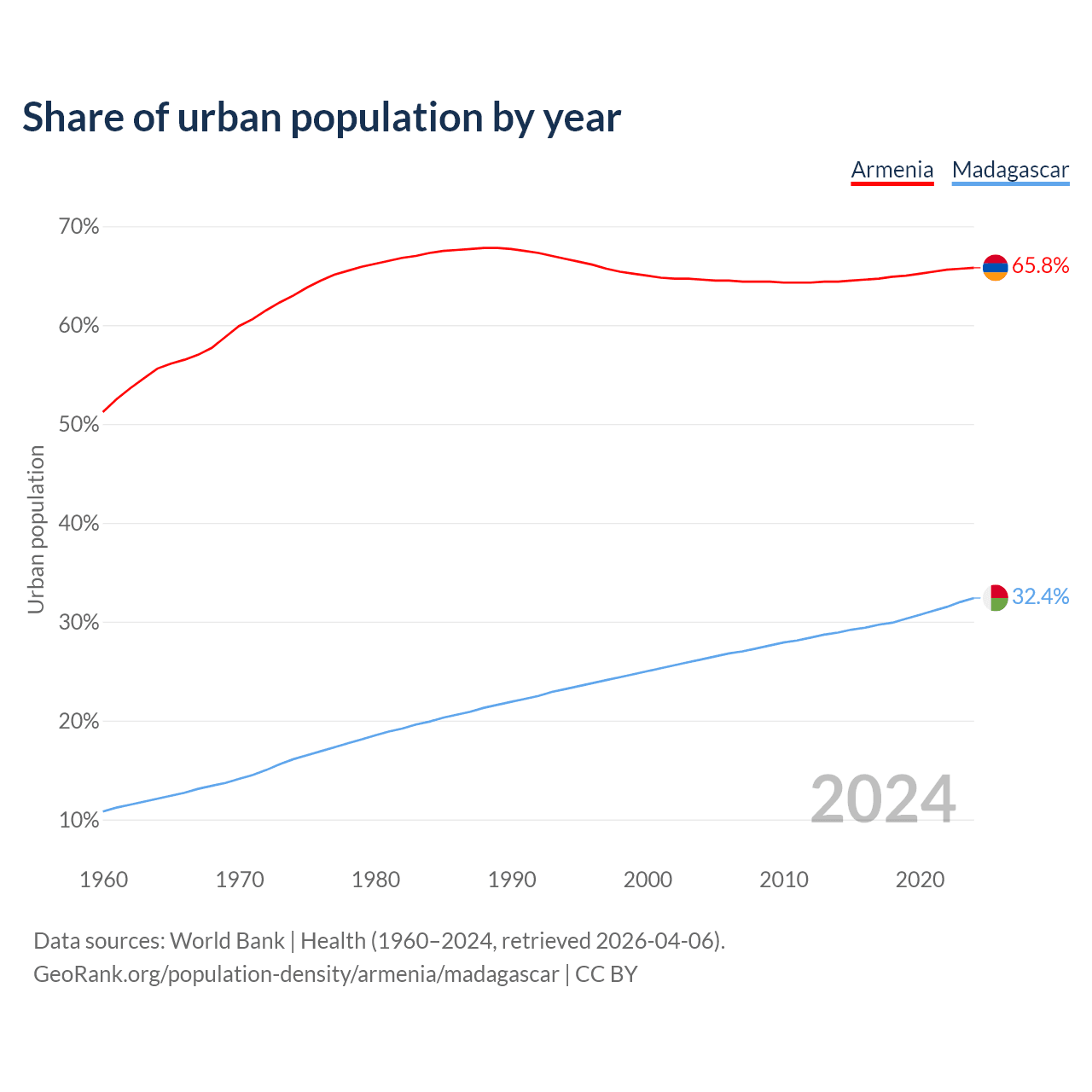 From 2004 to 2024, the share of urban population changed from 64.6% to 65.8% in Armenia and from 26.2% to 32.4% in Madagascar.